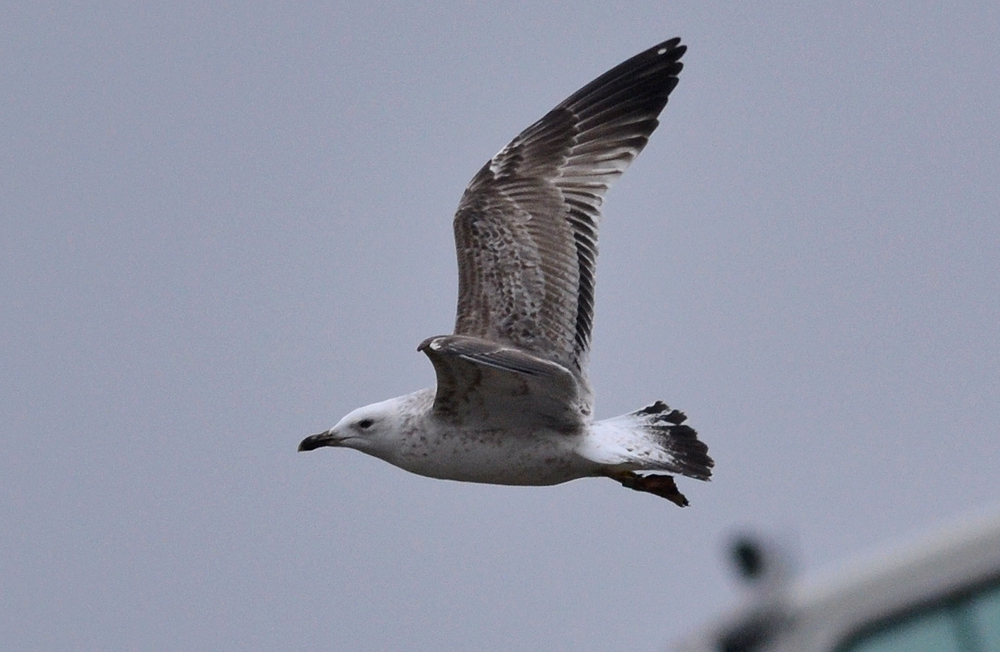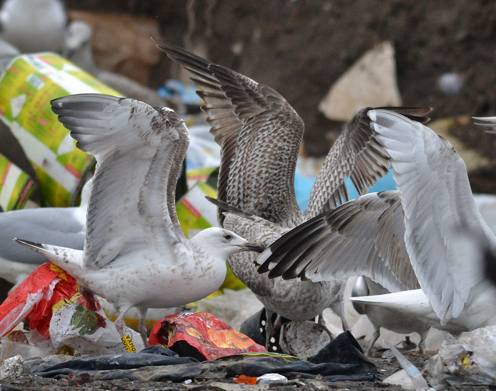 In this area are mixed breeding colonies (near Katowice), with far most birds breeding here are cachinnans, but in this area also records of very few michahellis from the south (e.g. ringed female from Italy) and argentatus from eastern Germany are possible (see PDF). PHXA is classic cachinnans. below: cachinnans 3CY PHXA February 27 2013, Deponie Pohlsche Heide - Minden, Germany (52°23'05N, 08°46'45E). Picture: Armin Deutsch. Very small mirror on ring wing P10 (no mirror on P10 left wing, see last image). MC replaced in partial autumn moult, now more greyish. Small compact bird, maybe female. below: cachinnans 3CY PHXA March 21 2013, Deponie Pohlsche Heide - Minden, Germany (52°23'05N, 08°46'45E). Picture: Armin Deutsch. Herring Gull in foreground probably one year older (4CY) and on the right green ringed 1CY cachinnans from Germany. |