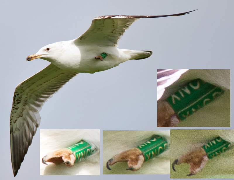Larus cachinnans 2CY-4CY XNCD 2013-2015, France & the Netherlands. Picture: Pierre Tillier, Ran Schols & Willy Raitière. Green XNCD and metal DEH (Hiddensee) EA..181624.