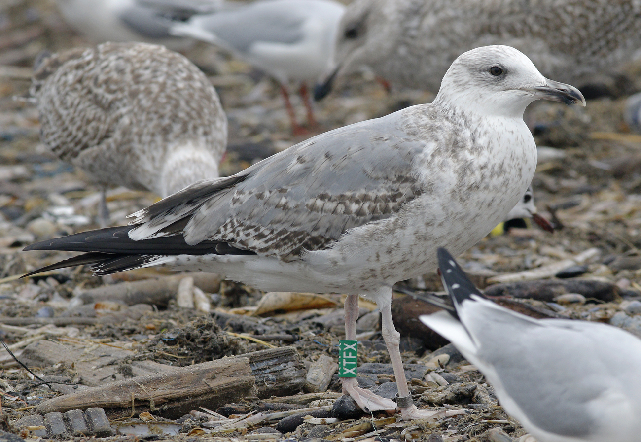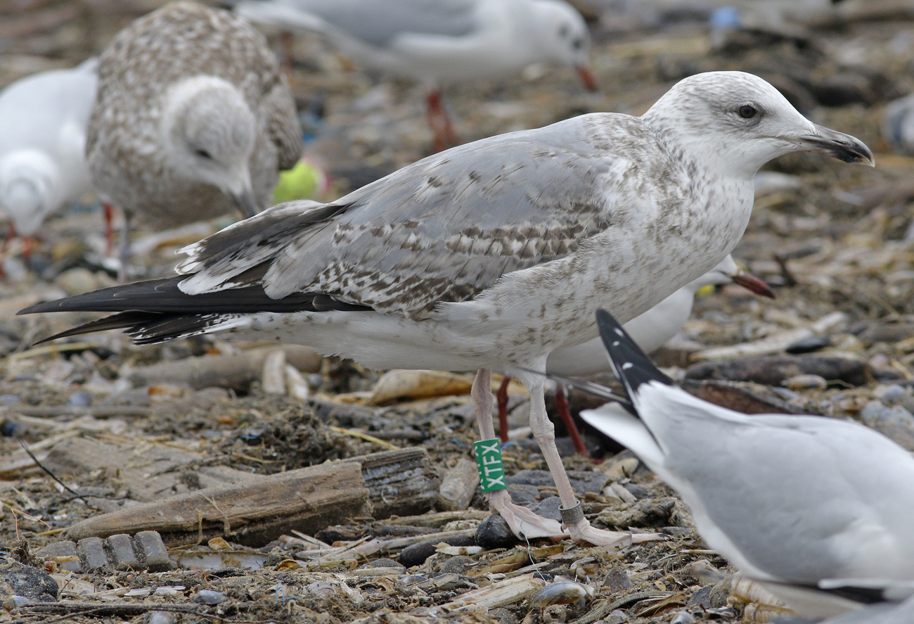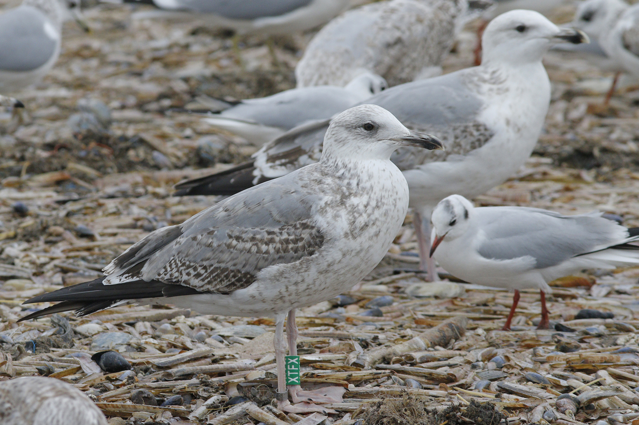 Larus cachinnans hybrid 3CY XTFX January 23 2017, Scheveningen, the Netherlands.Green XTFX and metal DEH Hiddensee EA-203086, ringed as pullus on June 09 2015 in a mixed colony of Gräbendorfer See - Brandenburg, eastern Germany (51,42N 14,06E). Location holds a mixed colony of argentatus and cachinnans mostly. In this bird, strong dominance of cachinnans: advanced partial autumn moult, flat gonys angle,and head shape. Streaked head and pattern on GC and LC batter match Herring Gull or even Yellow-legged Gull.