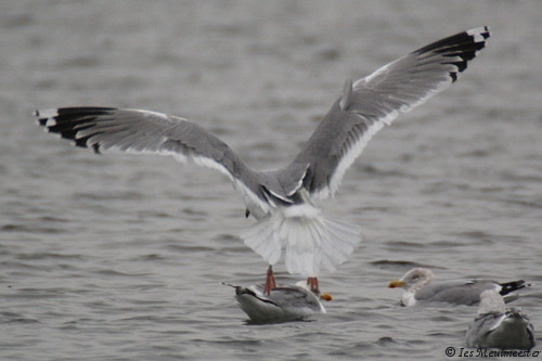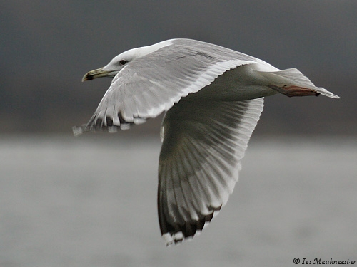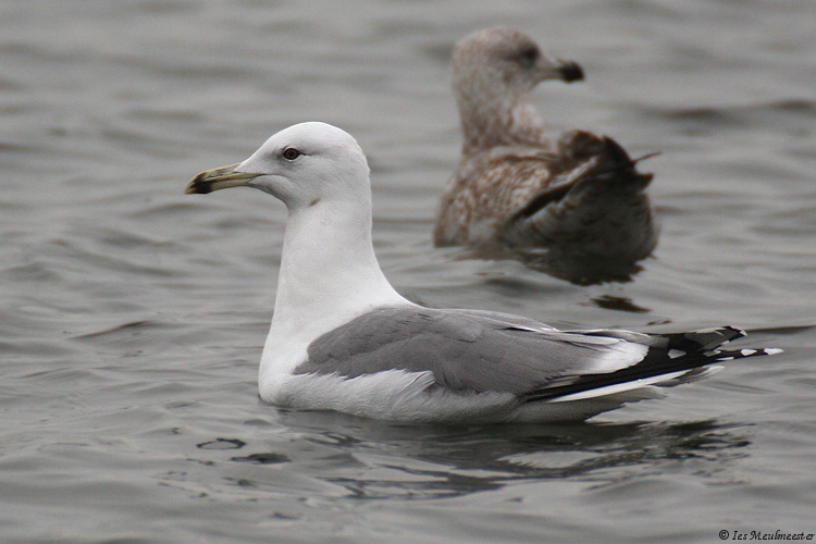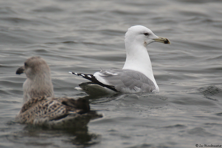 Larus cachinnans sub-adult, December 29 2009, Westkapelle, the Netherlands. Picture: Ies Meulmeester. Classic view of plumage shown by 4cy Caspian Gulls at the end of December. In this individual note the dull green-yellowish bill color and the broad black subterminal band at the gonys. Except from the bill and primary pattern(see pictures below) is the plumage of this individual in all respects like an adult. Note the subterminal black band on the top of P10 between the white mirror and the white primary tip and the black markings along the shafts of the primaries and primary coverts. |