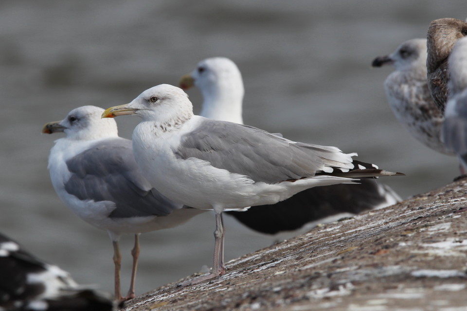 Larus cachinnans sub-adult, September 10-20 2010, Preila Pier - Neringa Spit, Lithuania. Picture: Chris Gibbins. P7/P10, with much subterminal black on P10. Limited peppering in iris and parallel bill. Note brown feathers just beneath greater covert row, indicating sub-adultness. |
