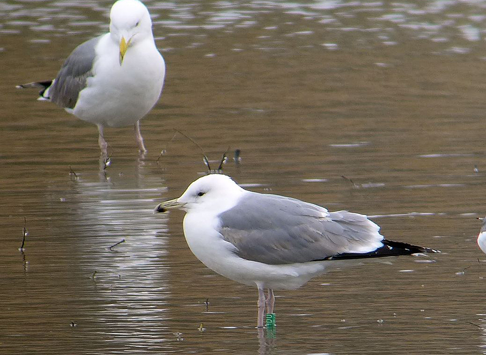 Larus cachinnans 4CY KHDU February 11 2013, Lake of Constance - Altenrhein, Switzerland. Picture: Stephan Trösch. Green KHDU, could it be XHDU from Germany? Obvious mirror on P10. However, still black in tail, black on central tertials and lesser coverts and black band on bill. |
