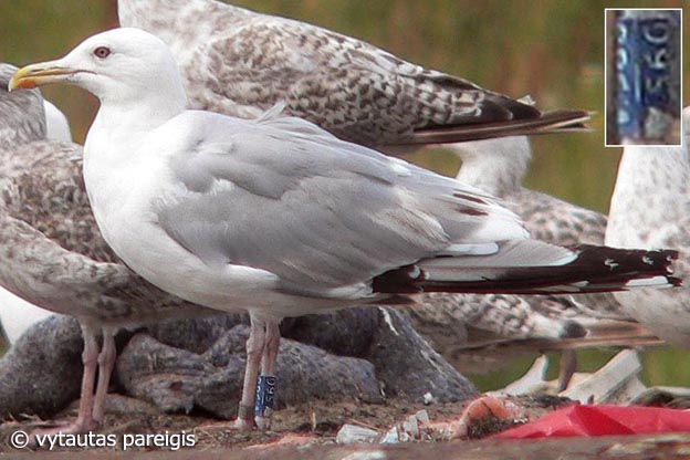 Larus cachinnans 4CY V560 July 19 2009, Dumpiai dump, Klaipeda, Lithuania. Picture: Vytautas Pareigis. Blue V560, ringed by Kjeld Tommy Pedersen in Denmark in winter, now in in summer in the Baltic states. Bird in active complete moult: P4 fully grown, P7-P10 still old. Note dark greater primary coverts and large mirror on P10 (3rd gen old primaries). |