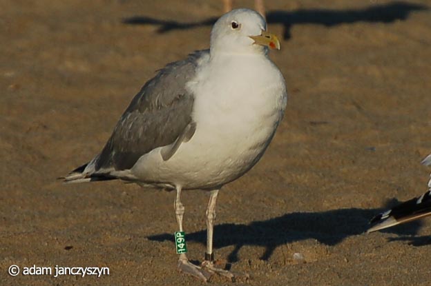 Larus cachinnans adult 149P August 22 2007, Krynica Morska, Poland. Picture: Adam Janczyszyn. Caspian Gull, green 149P. Bird probably ringed as breeding adult in 2006 at Jankowice Babice Malopolskie, S. Poland. Classic adult. |