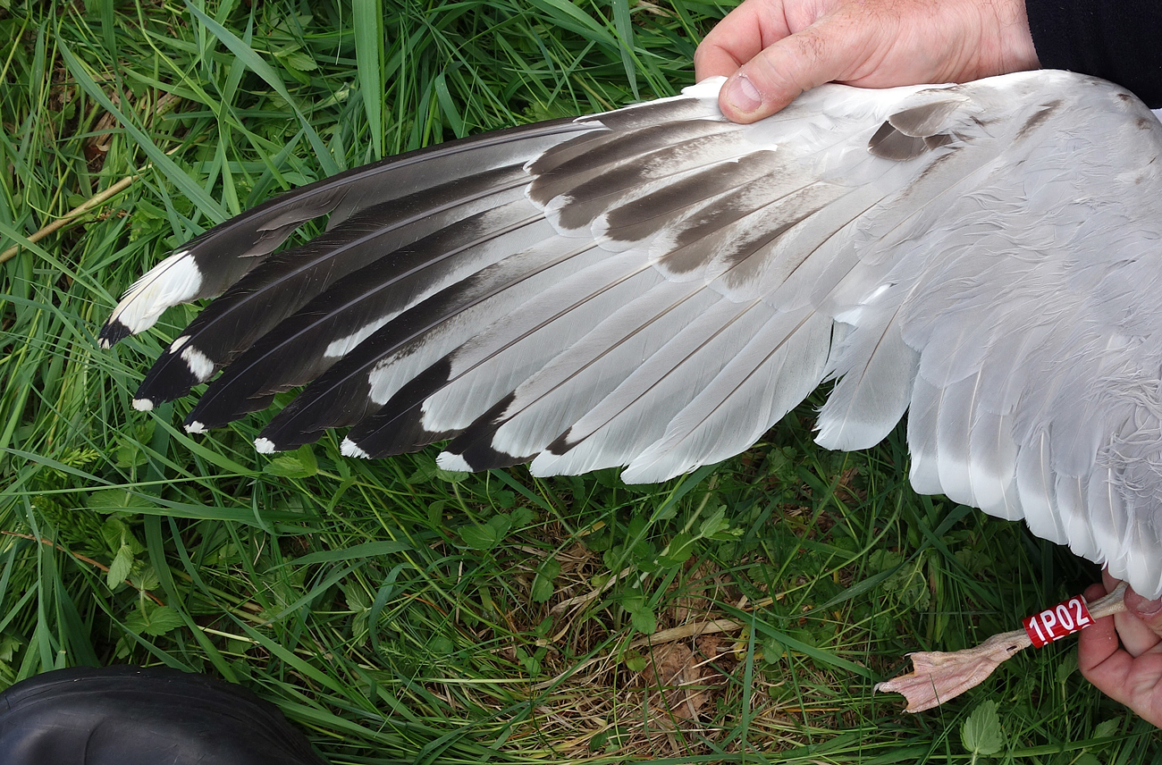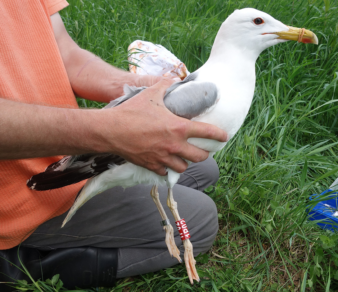 Larus cachinnans 1P02 sub-adult, May 14 2013, Wytyckie Lake - Urszulin, Poland. Picture: Łukasz Bednarz ringing team. Please visit Łukasz's BLOG for beautiful drawings and up-to-date gull news from eastern Poland: Wildlife art and illustration For 2012, breeding location of 150 pairs cachinnans, of which 54 adults ringed and 158 pulli in 2012 (pers comm. Łukasz Bednarz). Breeding bird trapped at the nest. Sub-adult, with markings on primary coverts, probably 4CY or 5CY. Dense speckling in iris. Red orbital ring and gape. No red on upper mandible; black on the upper and faint black on the lower mandible. Pale yellow legs.