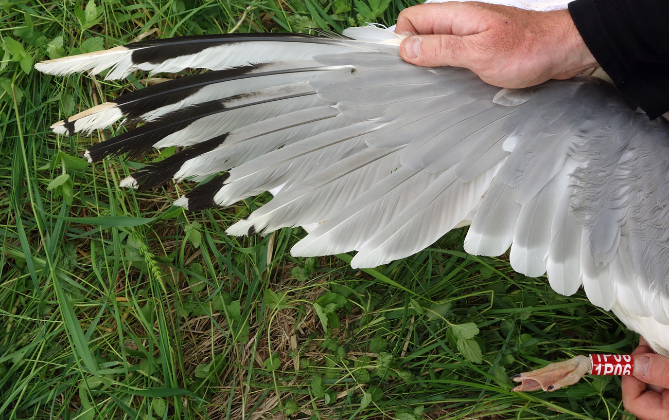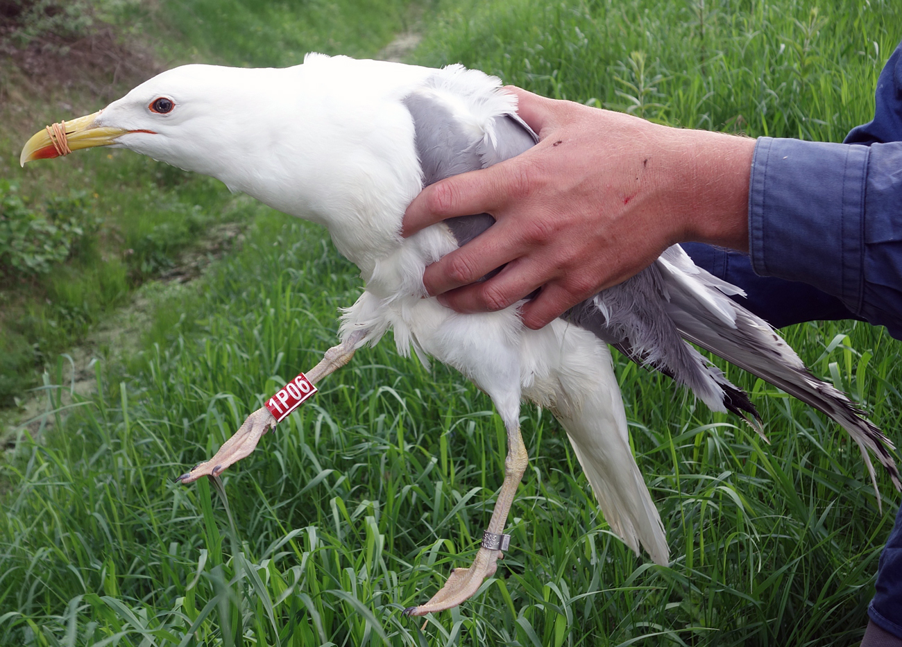 Larus cachinnans 1P06 adult, May 14 2013, Wytyckie Lake - Urszulin, Poland. Picture: Łukasz Bednarz ringing team. Please visit Łukasz's BLOG for beautiful drawings and up-to-date gull news from eastern Poland: Wildlife art and illustration For 2012, breeding location of 150 pairs cachinnans, of which 54 adults ringed and 158 pulli in 2012 (pers comm. Łukasz Bednarz). Breeding bird trapped at the nest. Adult, with dense speckling in iris. Red orbital ring and gape. No red on upper mandible; no black on the upper and no black on the lower mandible. Pale yellow legs. In this bird note the obvious good condition of the tips of P3-P4, which are hidden under the tertials in resting birds.