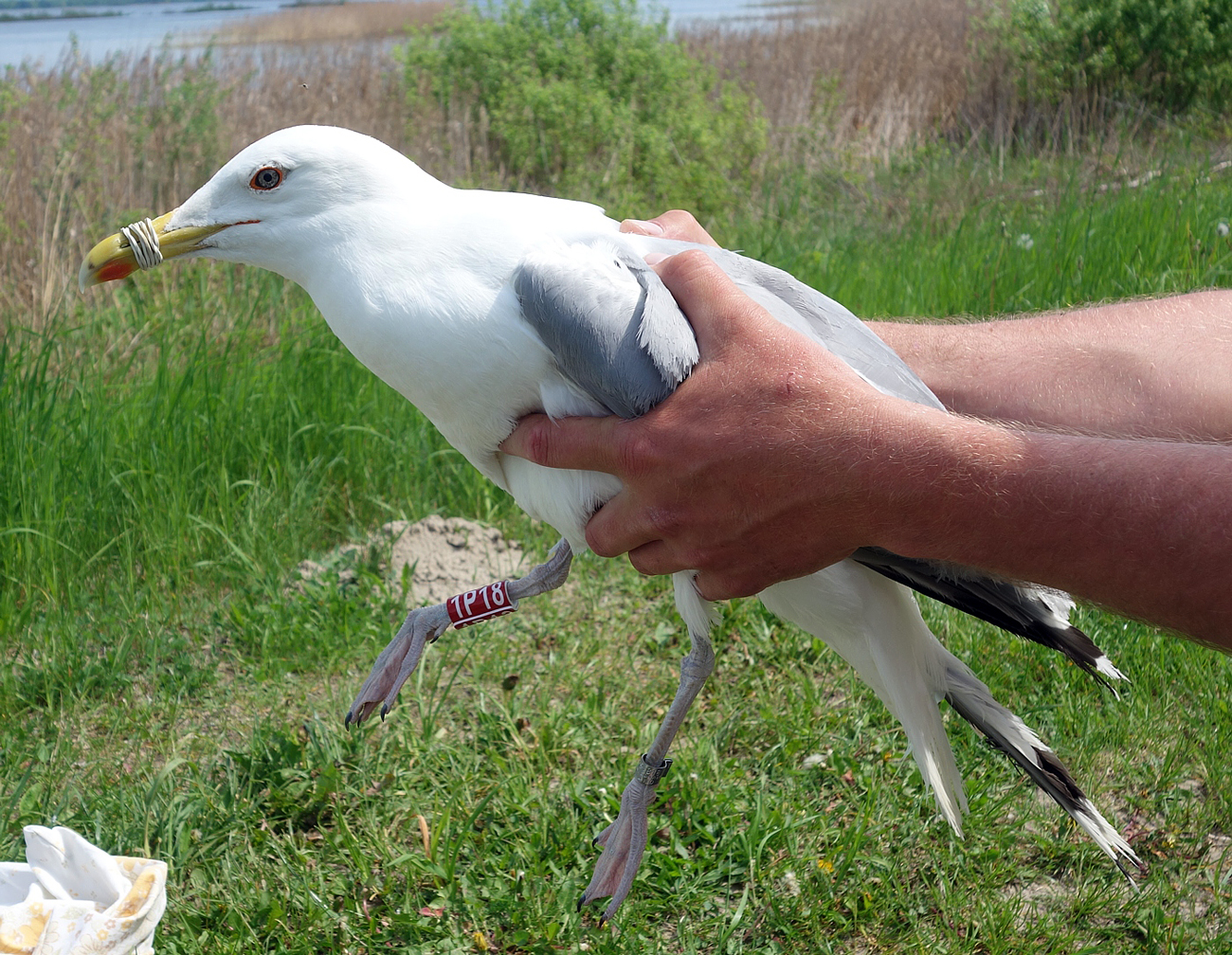 Larus cachinnans 1P18 adult, May 15 2013, Wytyckie Lake - Urszulin, Poland. Picture: Łukasz Bednarz ringing team. Please visit Łukasz's BLOG for beautiful drawings and up-to-date gull news from eastern Poland: Wildlife art and illustration For 2012, breeding location of 150 pairs cachinnans, of which 54 adults ringed and 158 pulli in 2012 (pers comm. Łukasz Bednarz). Breeding bird trapped at the nest. Adult, with dense speckling in iris. Red orbital ring and gape. No red on upper mandible; black on the upper and faint black on the lower mandible. Pink legs.