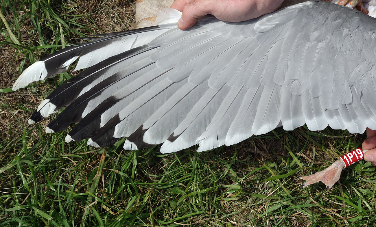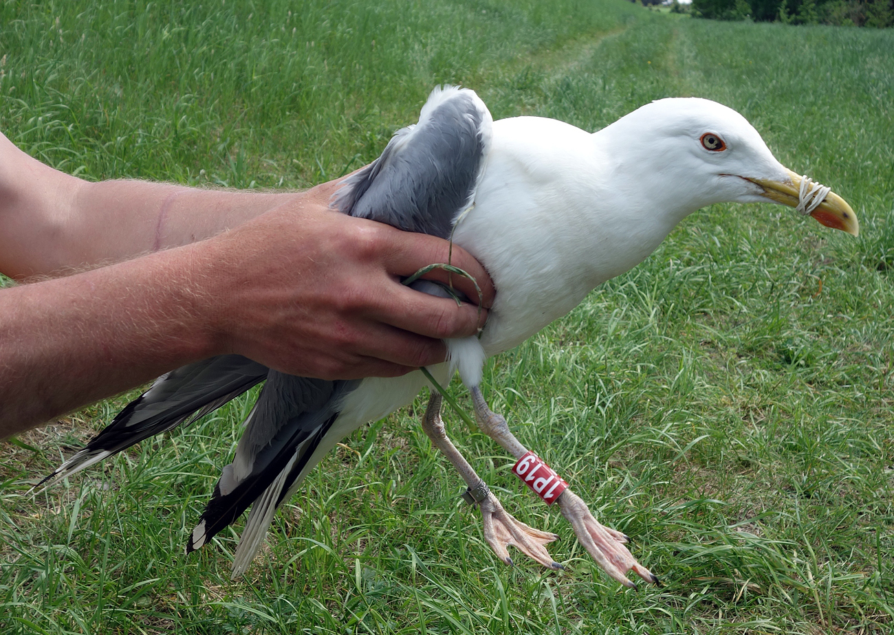 Larus cachinnans 1P19 adult, May 15 2013, Wytyckie Lake - Urszulin, Poland. Picture: Łukasz Bednarz ringing team. Please visit Łukasz's BLOG for beautiful drawings and up-to-date gull news from eastern Poland: Wildlife art and illustration For 2012, breeding location of 150 pairs cachinnans, of which 54 adults ringed and 158 pulli in 2012 (pers comm. Łukasz Bednarz). Breeding bird trapped at the nest. Adult, with limited speckling in iris. Red orbital ring and gape. No red on upper mandible; black on the upper and no black on the lower mandible. Pink legs.