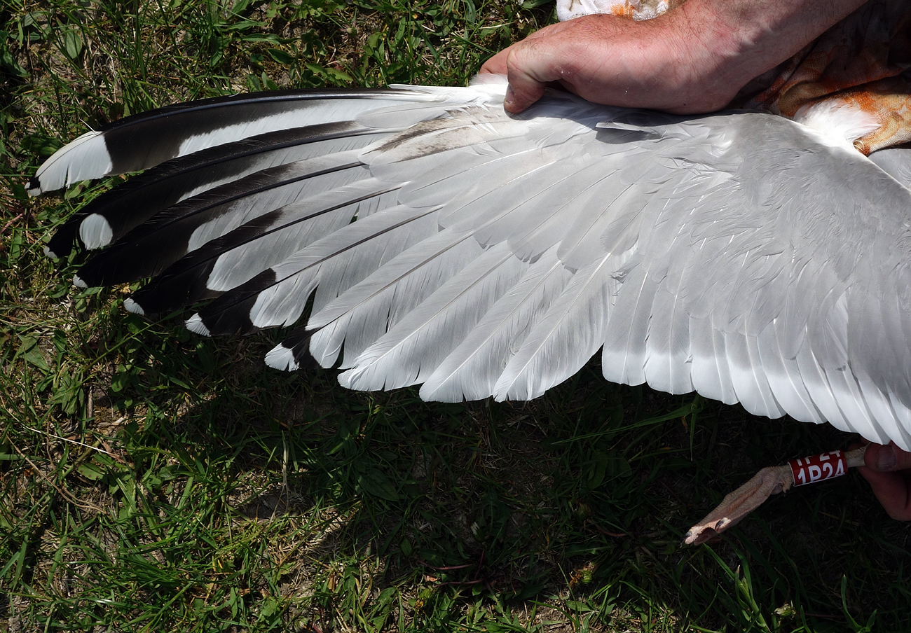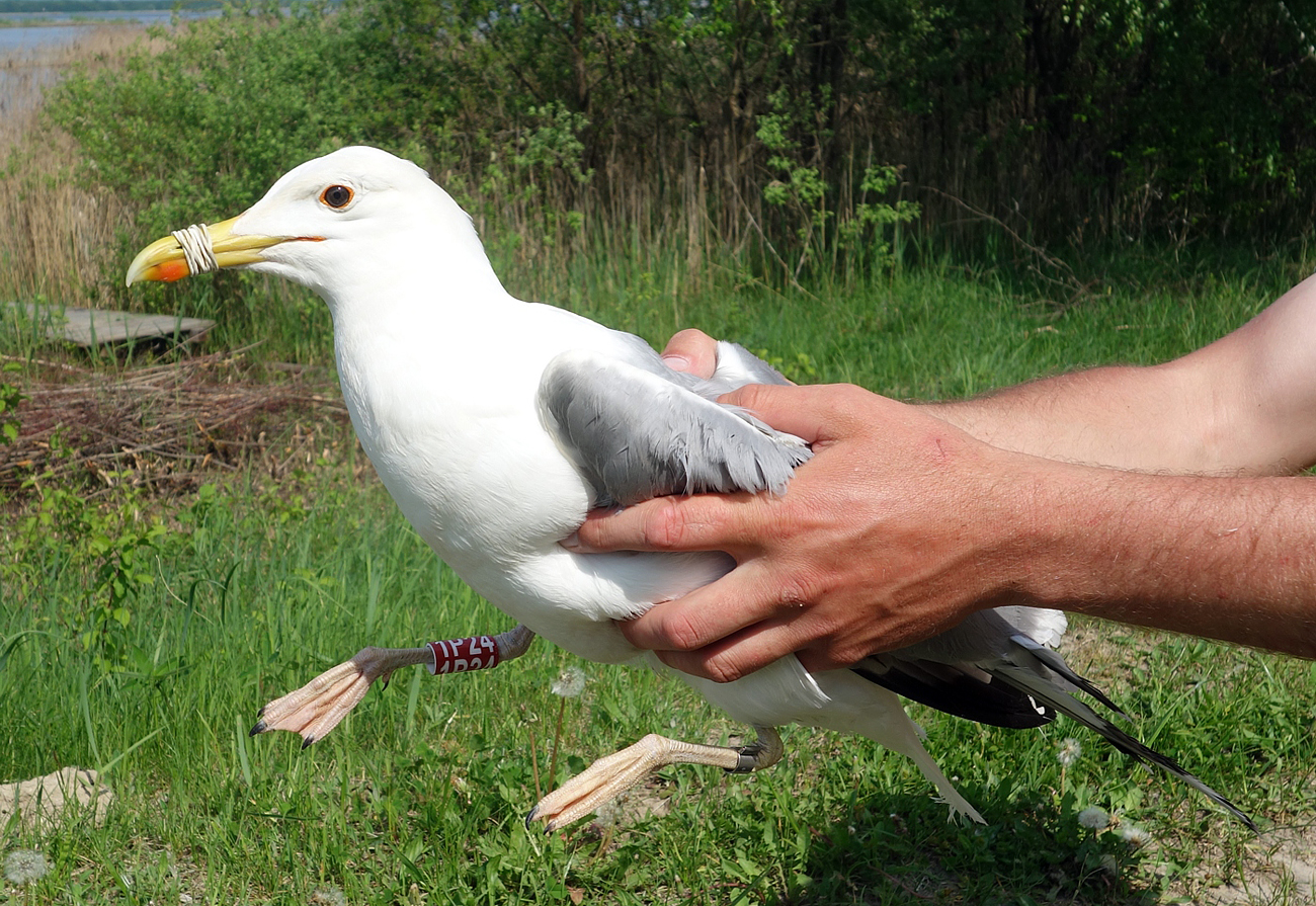 Larus cachinnans 1P24 sub-adult, May 15 2013, Wytyckie Lake - Urszulin, Poland. Picture: Łukasz Bednarz ringing team. Please visit Łukasz's BLOG for beautiful drawings and up-to-date gull news from eastern Poland: Wildlife art and illustration For 2012, breeding location of 150 pairs cachinnans, of which 54 adults ringed and 158 pulli in 2012 (pers comm. Łukasz Bednarz). Breeding bird trapped at the nest. Sub-adult, with some black on primary coverts, probably 5CY. Dense speckling in iris. Orange-red orbital ring and gape. No red on upper mandible; faint black on the upper and black on the lower mandible. Pale yellow legs.