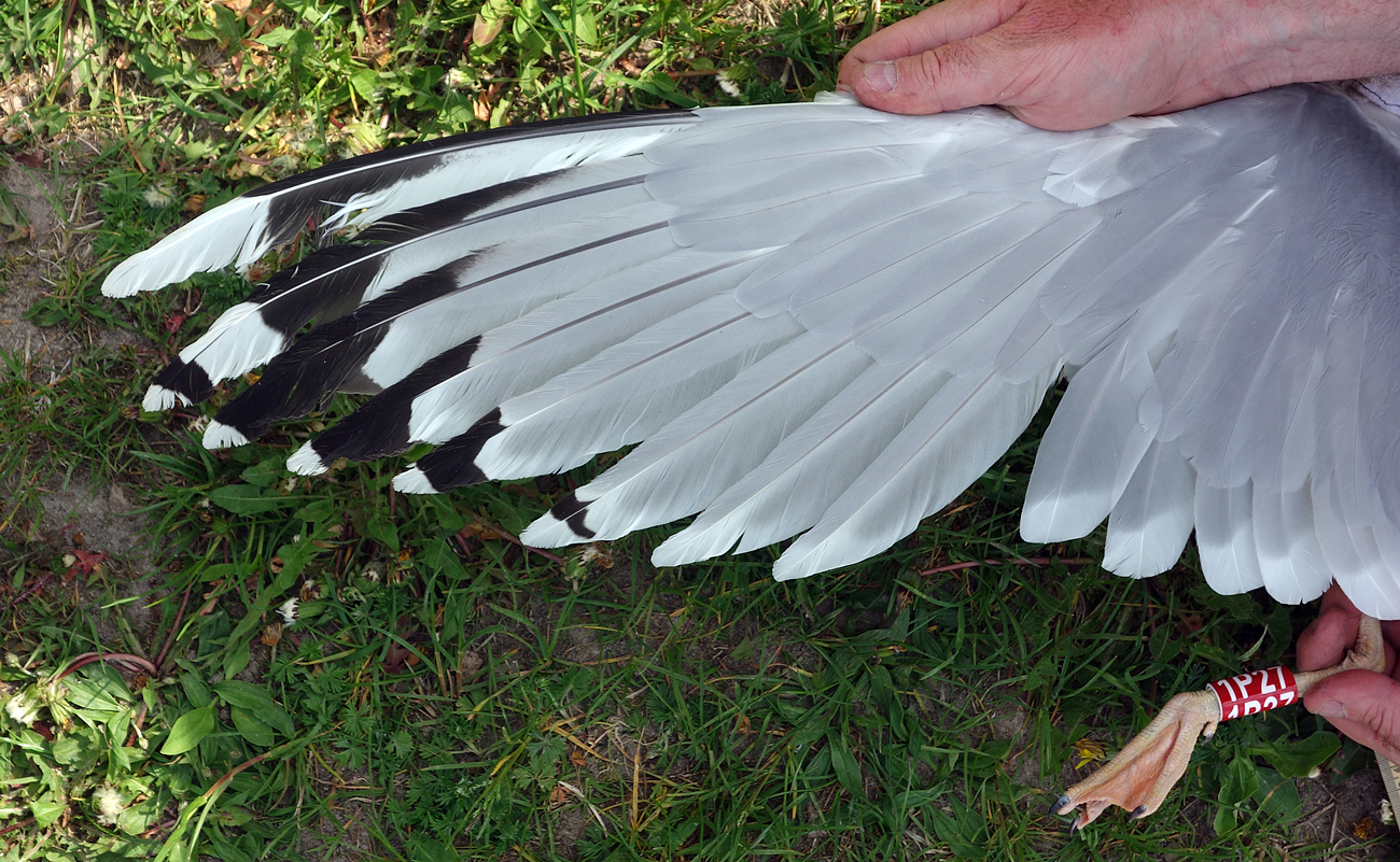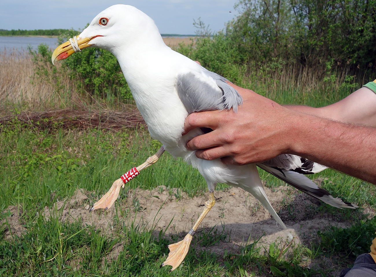Larus cachinnans 1P27 adult, May 15 2013, Wytyckie Lake - Urszulin, Poland. Picture: Łukasz Bednarz ringing team. Please visit Łukasz's BLOG for beautiful drawings and up-to-date gull news from eastern Poland: Wildlife art and illustration For 2012, breeding location of 150 pairs cachinnans, of which 54 adults ringed and 158 pulli in 2012 (pers comm. Łukasz Bednarz). Breeding bird trapped at the nest. Adult, with limited speckling in iris. Red orbital ring and gape. No red on upper mandible; no black on the upper and no black on the lower mandible. Yellow legs.