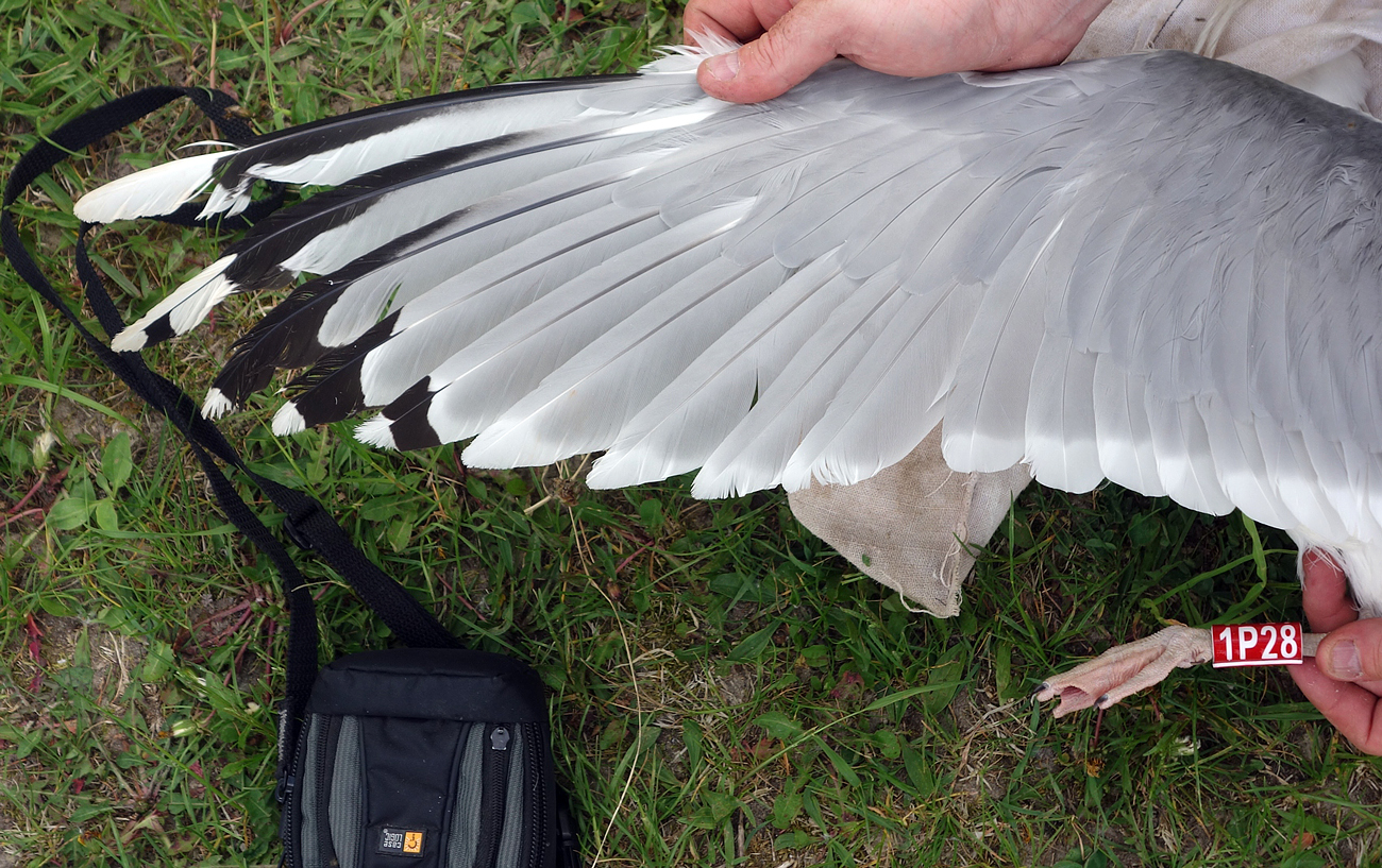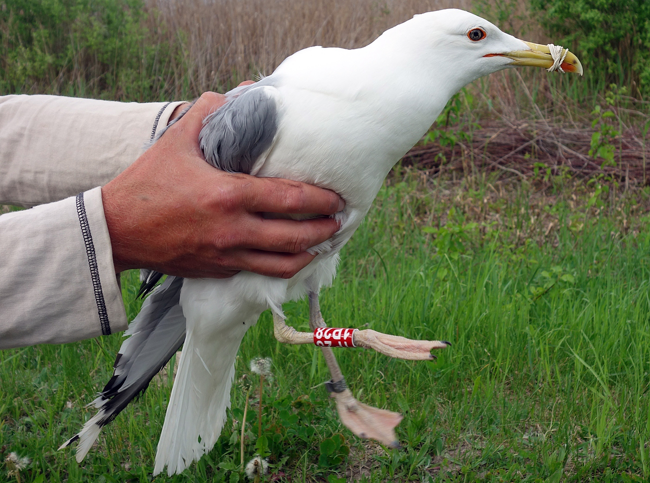 Larus cachinnans 1P28 adult, May 15 2013, Wytyckie Lake - Urszulin, Poland. Picture: Łukasz Bednarz ringing team. Please visit Łukasz's BLOG for beautiful drawings and up-to-date gull news from eastern Poland: Wildlife art and illustration For 2012, breeding location of 150 pairs cachinnans, of which 54 adults ringed and 158 pulli in 2012 (pers comm. Łukasz Bednarz). Breeding bird trapped at the nest. Adult, with dense speckling in iris. Red orbital ring and gape. No red on upper mandible; black on the upper and black on the lower mandible. Pink legs with yellow hue.