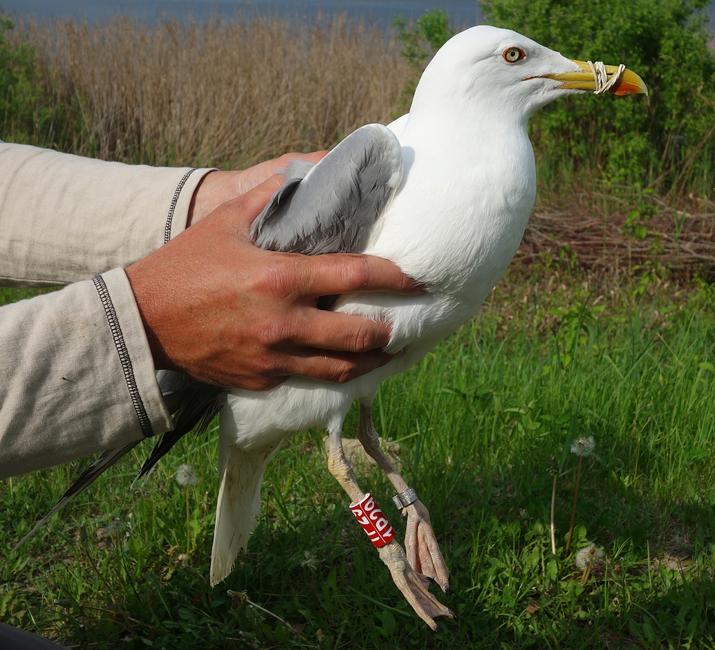 Larus cachinnans 1P29 adult, May 15 2013, Wytyckie Lake - Urszulin, Poland. Picture: Łukasz Bednarz ringing team. Please visit Łukasz's BLOG for beautiful drawings and up-to-date gull news from eastern Poland: Wildlife art and illustration For 2012, breeding location of 150 pairs cachinnans, of which 54 adults ringed and 158 pulli in 2012 (pers comm. Łukasz Bednarz). Breeding bird trapped at the nest. Adult, with very limited speckling in iris (1-5%). Red orbital ring and gape. No red on upper mandible; no black on the upper and no black on the lower mandible. Pink legs with yellow hue.