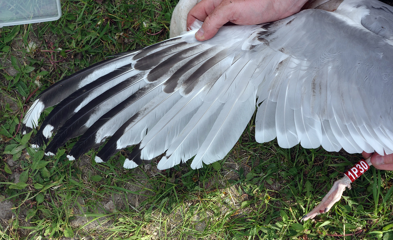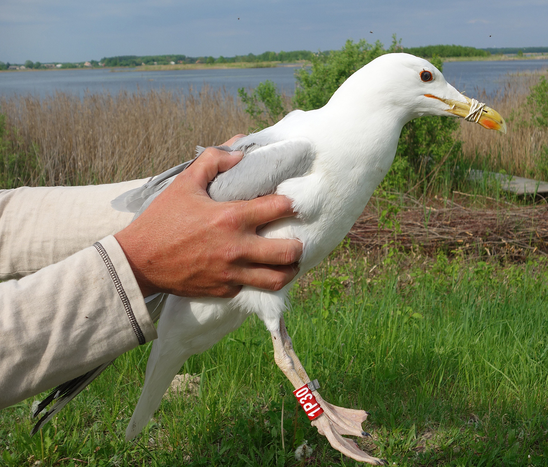 Larus cachinnans 1P30 sub-adult, May 15 2013, Wytyckie Lake - Urszulin, Poland. Picture: Łukasz Bednarz ringing team. Please visit Łukasz's BLOG for beautiful drawings and up-to-date gull news from eastern Poland: Wildlife art and illustration For 2012, breeding location of 150 pairs cachinnans, of which 54 adults ringed and 158 pulli in 2012 (pers comm. Łukasz Bednarz). Breeding bird trapped at the nest. Sub-adult, with obvious black on primary coverts, 4CY or 5CY. Dense speckling in iris. Red orbital ring and gape. No red on upper mandible; black on the upper and black on the lower mandible. Yellow legs.