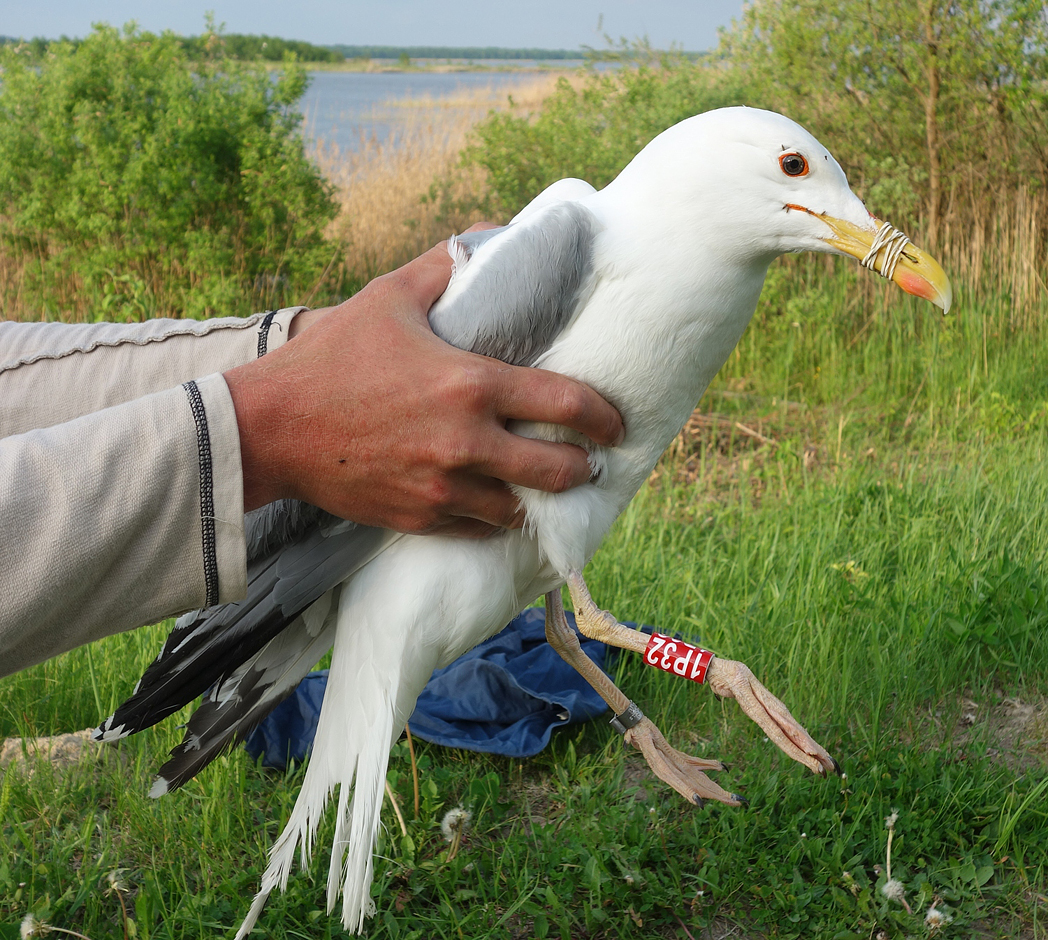 Larus cachinnans 1P32 adult, May 15 2013 & June 10 2014, Wytyckie Lake - Urszulin, Poland. Picture: Łukasz Bednarz ringing team. Please visit Łukasz's BLOG for beautiful drawings and up-to-date gull news from eastern Poland: Wildlife art and illustration For 2012, breeding location of 150 pairs cachinnans, of which 54 adults ringed and 158 pulli in 2012 (pers comm. Łukasz Bednarz). below: Larus cachinnans 1P32 adult, May 15 2013, Wytyckie Lake - Urszulin, Poland. Picture: Łukasz Bednarz ringing team. Breeding bird trapped at the nest. Adult, with dense speckling in iris. Red orbital ring and gape. No red on upper mandible; no black on the upper and no black on the lower mandible. Yellow legs.