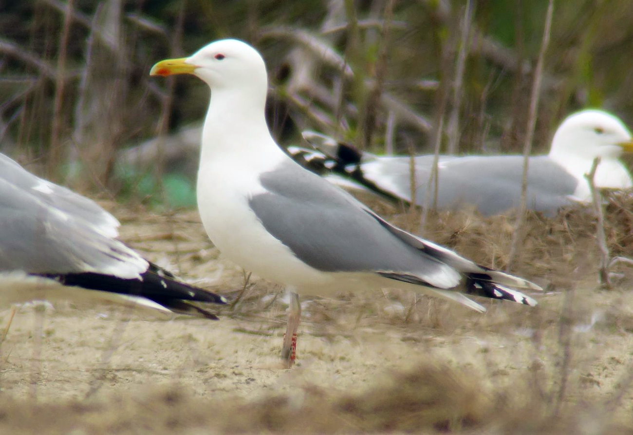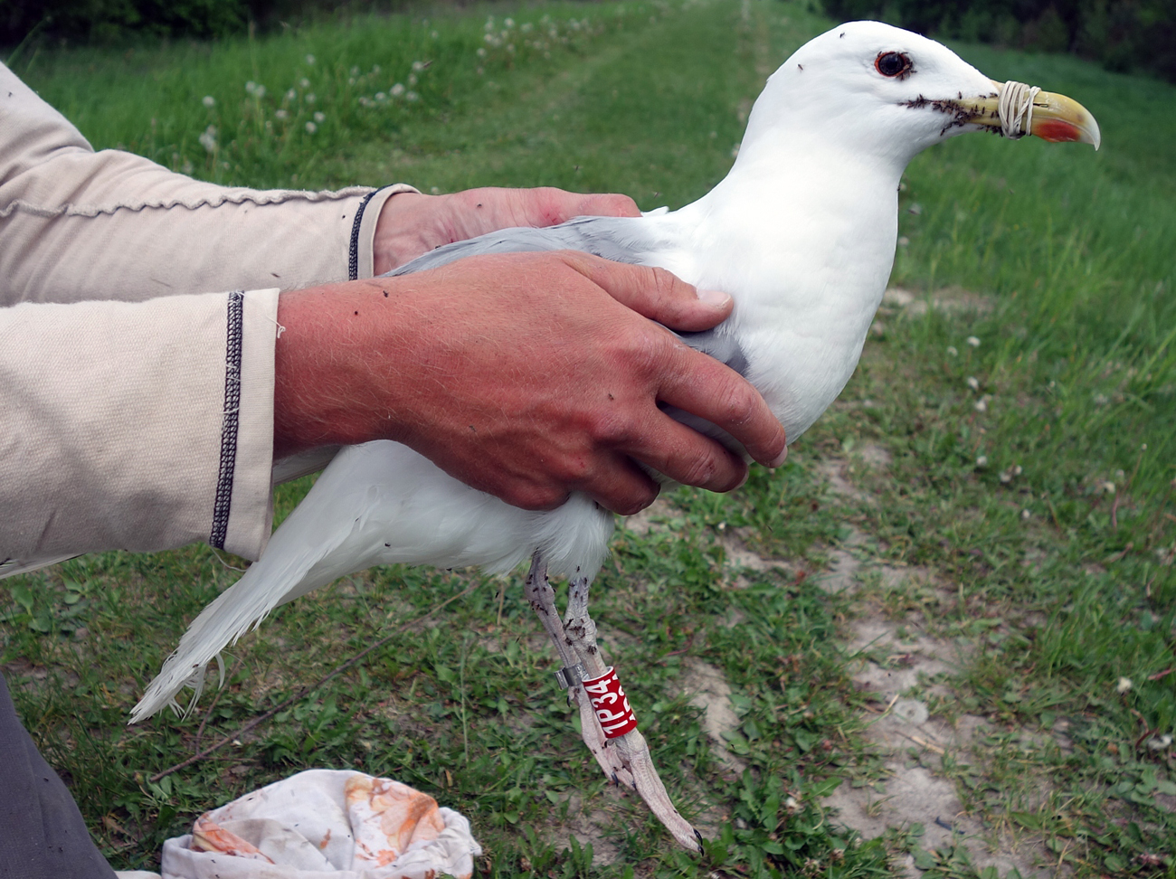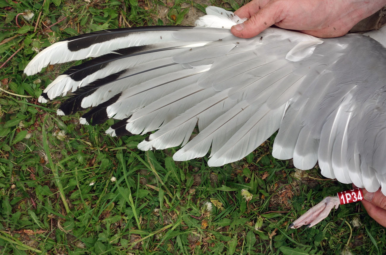 Larus cachinnans 1P34 adult, May 2013, Wytyckie Lake & April 2014, Zastów Karczmiski, Poland. Picture: Łukasz Bednarz ringing team. Please visit Łukasz's BLOG for beautiful drawings and up-to-date gull news from eastern Poland: Wildlife art and illustration For 2012, breeding location of 150 pairs cachinnans, of which 54 adults ringed and 158 pulli in 2012 (pers comm. Łukasz Bednarz). below: Larus cachinnans 1P34 adult, May 15 2013, Wytyckie Lake - Urszulin, Poland. Picture: Łukasz Bednarz ringing team. Breeding bird trapped at the nest. Adult, with dense speckling in iris. Red orbital ring and gape. No red on upper mandible; black on the upper and faint black on the lower mandible. Pink legs.