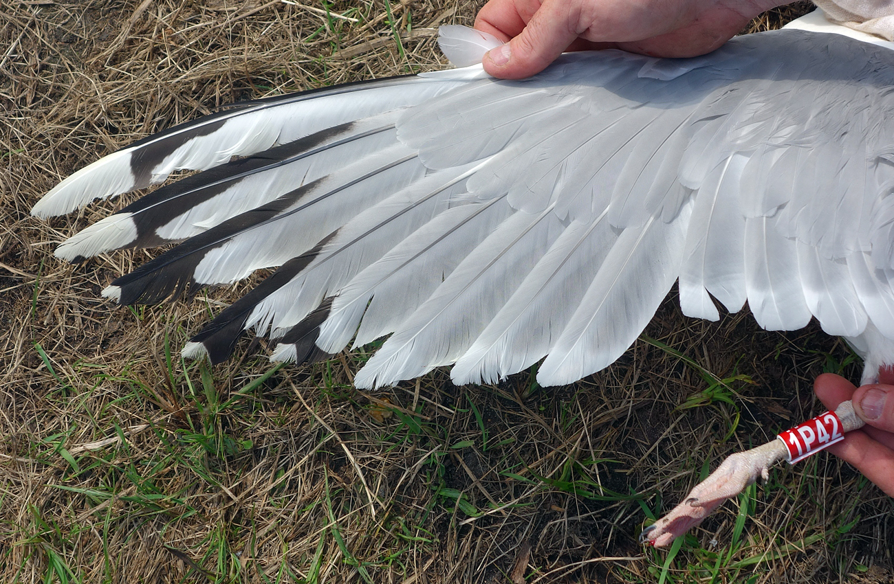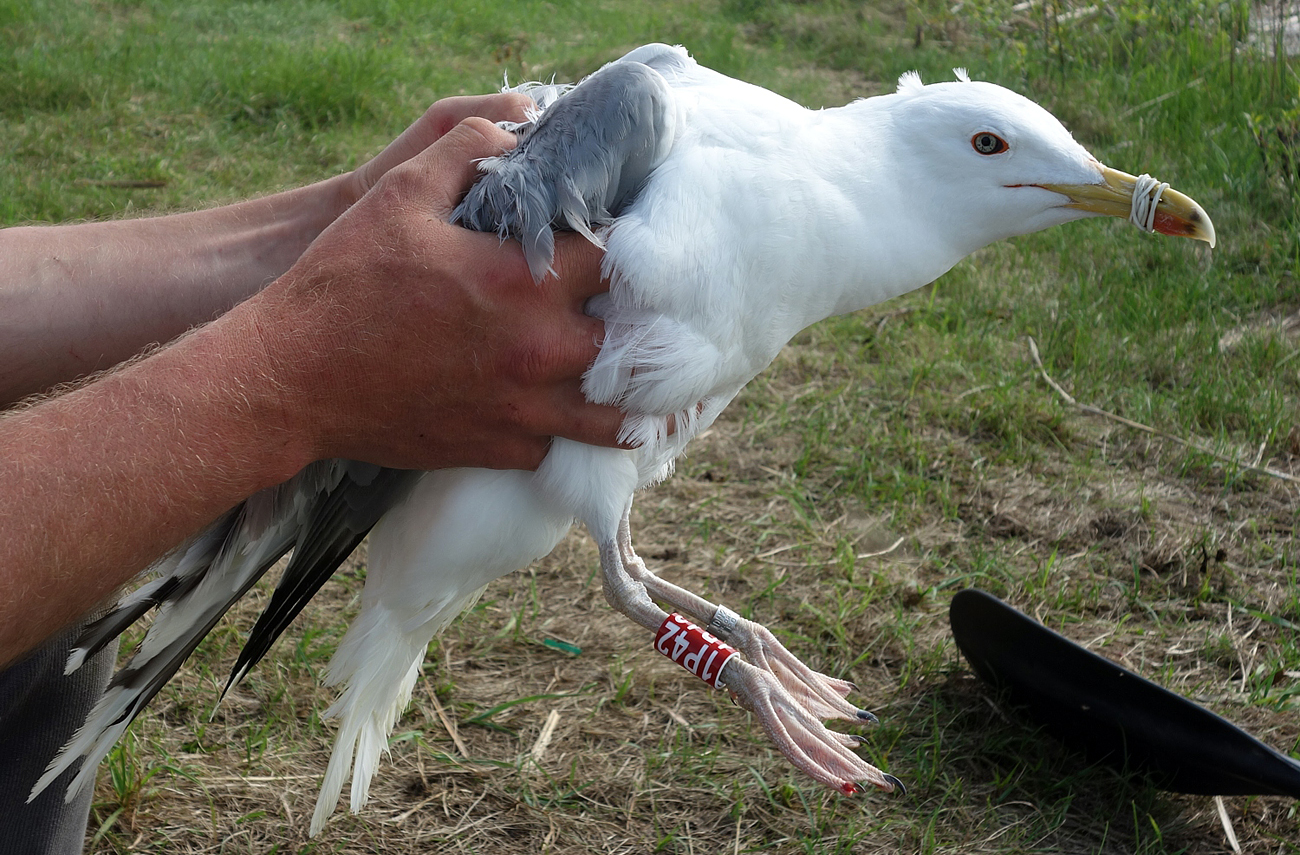 Larus cachinnans 1P42 adult, May 16 2013, Wytyckie Lake - Urszulin, Poland. Picture: Łukasz Bednarz ringing team. Please visit Łukasz's BLOG for beautiful drawings and up-to-date gull news from eastern Poland: Wildlife art and illustration For 2012, breeding location of 150 pairs cachinnans, of which 54 adults ringed and 158 pulli in 2012 (pers comm. Łukasz Bednarz). Breeding bird trapped at the nest. Adult, with moderate speckling in iris. Red orbital ring and gape. No red on upper mandible; black on the upper and black on the lower mandible. Pink legs with yellow hue.