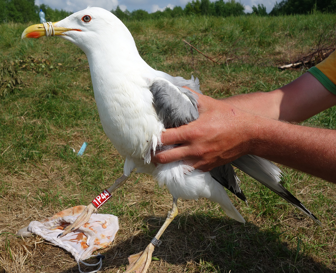 Larus cachinnans 1P44 adult, May 16 2013, Wytyckie Lake - Urszulin, Poland. Picture: Łukasz Bednarz ringing team. Please visit Łukasz's BLOG for beautiful drawings and up-to-date gull news from eastern Poland: Wildlife art and illustration For 2012, breeding location of 150 pairs cachinnans, of which 54 adults ringed and 158 pulli in 2012 (pers comm. Łukasz Bednarz). Breeding bird trapped at the nest. Adult, with dense speckling in iris. Red orbital ring and gape. No red on upper mandible; faint black on the upper and no black on the lower mandible. Yellow legs.