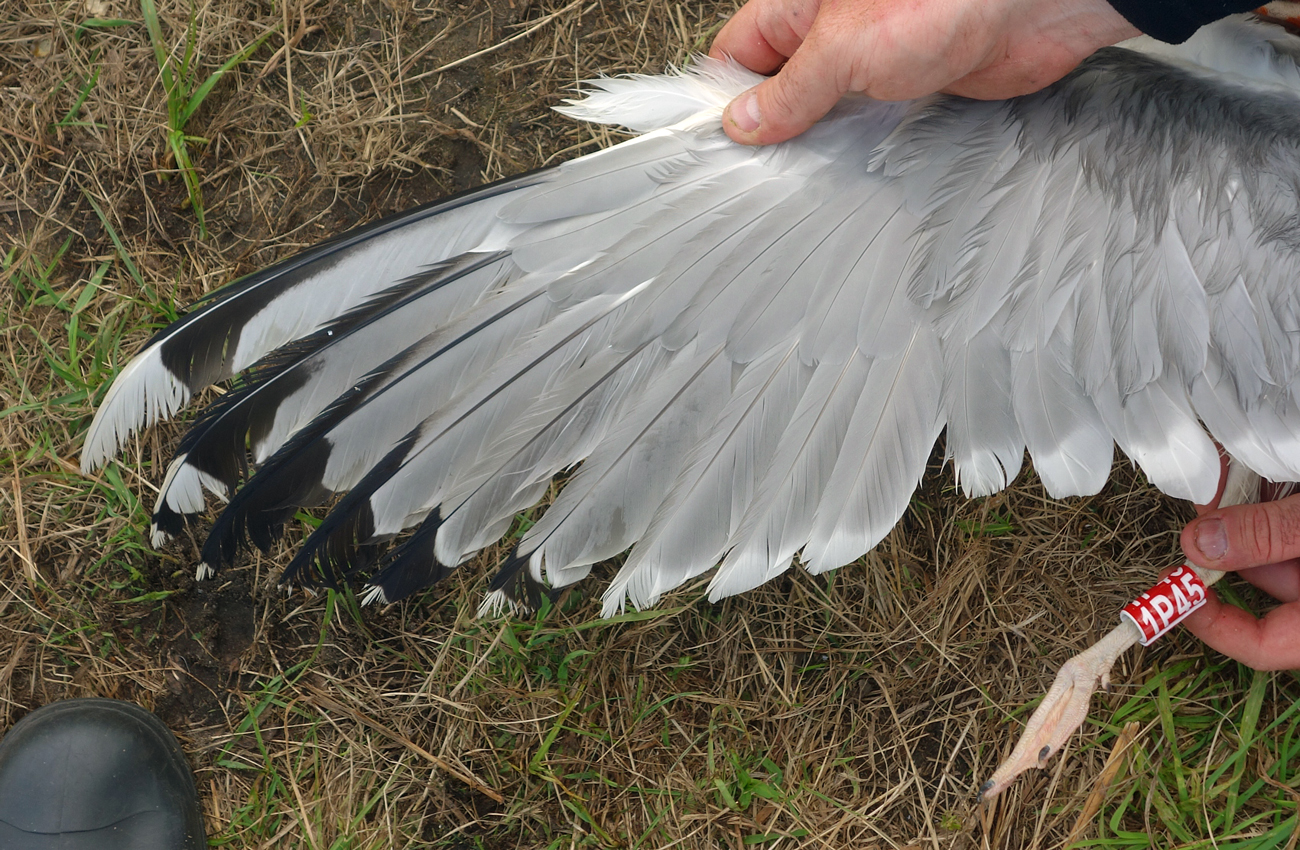 Larus cachinnans 1P45 adult, May 16 2013, Wytyckie Lake - Urszulin, Poland. Picture: Łukasz Bednarz ringing team. Please visit Łukasz's BLOG for beautiful drawings and up-to-date gull news from eastern Poland: Wildlife art and illustration For 2012, breeding location of 150 pairs cachinnans, of which 54 adults ringed and 158 pulli in 2012 (pers comm. Łukasz Bednarz). Breeding bird trapped at the nest. Adult, with limited speckling in iris. Orange-red orbital ring and gape. No red on upper mandible; no black on the upper and no black on the lower mandible. Pink legs with yellow hue.