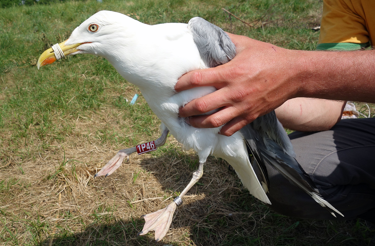 Larus argentatus sensu lato 1P46 adult, May 16 2013, Wytyckie Lake - Urszulin, Poland. Picture: Łukasz Bednarz ringing team. Please visit Łukasz's BLOG for beautiful drawings and up-to-date gull news from eastern Poland: Wildlife art and illustration For 2012, breeding location of 150 pairs cachinnans, of which 54 adults ringed and 158 pulli in 2012 (pers comm. Łukasz Bednarz). Breeding bird trapped at the nest. Adult, with limited speckling in iris (0-1%) and much black in wingtip, in these two traits differing from average cachinnans and therefore considered "Larus argentatus sensu lato".