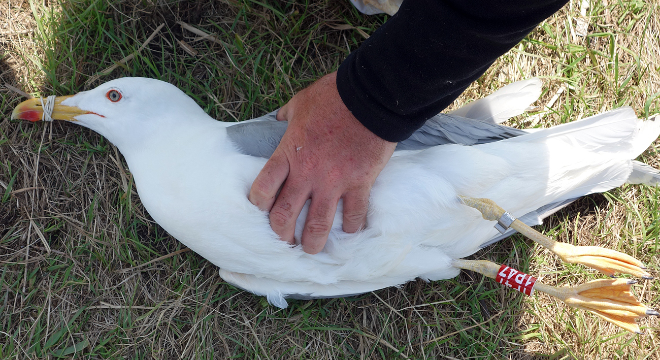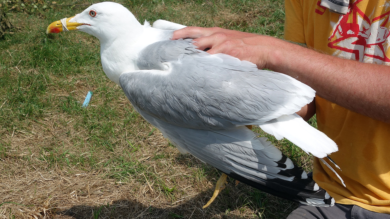 Larus cachinnans 1P47 adult, May 16 2013, Wytyckie Lake - Urszulin, Poland. Picture: Łukasz Bednarz ringing team. Please visit Łukasz's BLOG for beautiful drawings and up-to-date gull news from eastern Poland: Wildlife art and illustration For 2012, breeding location of 150 pairs cachinnans, of which 54 adults ringed and 158 pulli in 2012 (pers comm. Łukasz Bednarz). Breeding bird trapped at the nest. Adult, with onbious gonys angle and saturated bare parts and rich red on bill (reminiscent of michahellis). Moderate speckling in iris. Red orbital ring and gape. Red on upper mandible; faint black on the upper and no black on the lower mandible. Saturated yellow legs.