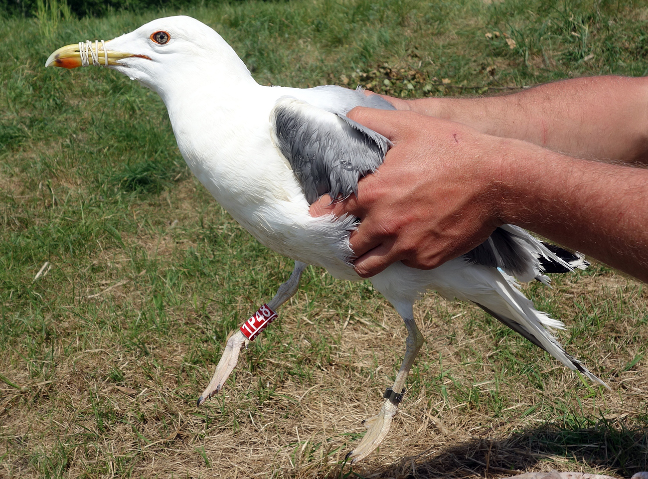 Larus cachinnans 1P48 adult, May 16 2013, Wytyckie Lake - Urszulin, Poland. Picture: Łukasz Bednarz ringing team. Please visit Łukasz's BLOG for beautiful drawings and up-to-date gull news from eastern Poland: Wildlife art and illustration For 2012, breeding location of 150 pairs cachinnans, of which 54 adults ringed and 158 pulli in 2012 (pers comm. Łukasz Bednarz). Breeding bird trapped at the nest. Adult, with dense speckling in iris. Red orbital ring and gape. No red on upper mandible; black on the upper and black on the lower mandible. Pink legs with yellow hue.