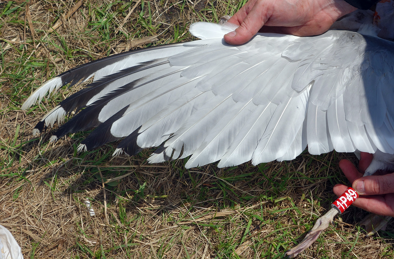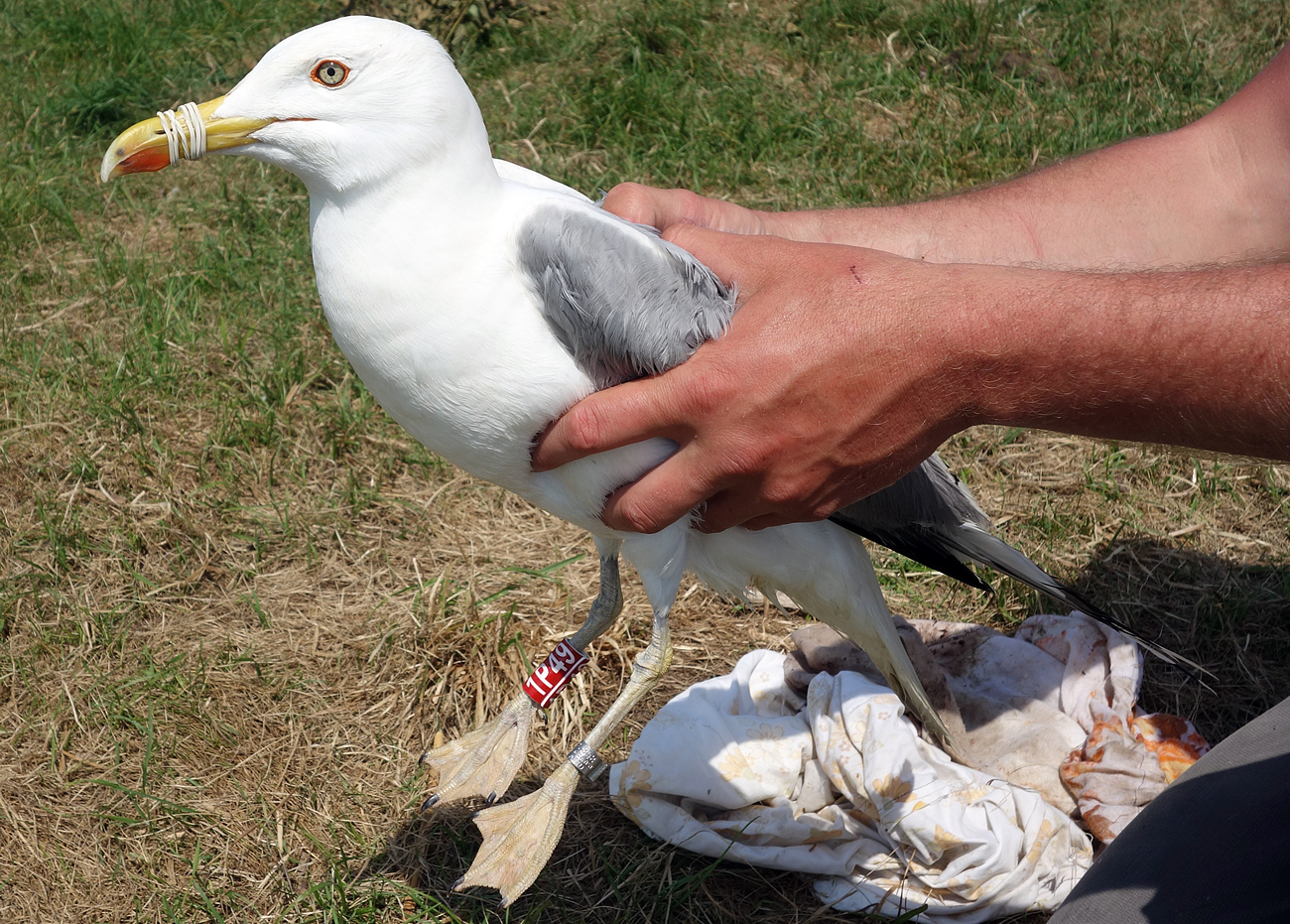Larus cachinnans 1P49 adult, May 16 2013, Wytyckie Lake - Urszulin, Poland. Picture: Łukasz Bednarz ringing team. Please visit Łukasz's BLOG for beautiful drawings and up-to-date gull news from eastern Poland: Wildlife art and illustration For 2012, breeding location of 150 pairs cachinnans, of which 54 adults ringed and 158 pulli in 2012 (pers comm. Łukasz Bednarz). Breeding bird trapped at the nest. Adult, with limited speckling in iris. Red orbital ring and gape. No red on upper mandible; black on the upper and black on the lower mandible. Pale yellow legs.