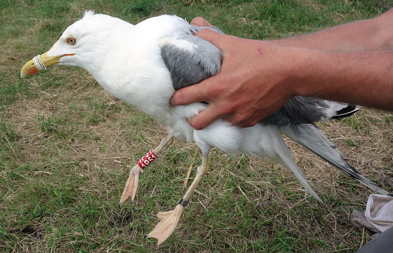 Larus cachinnans 1P51 adult, May 16 2013, Wytyckie Lake - Urszulin, Poland. Picture: Łukasz Bednarz ringing team. Please visit Łukasz's BLOG for beautiful drawings and up-to-date gull news from eastern Poland: Wildlife art and illustration For 2012, breeding location of 150 pairs cachinnans, of which 54 adults ringed and 158 pulli in 2012 (pers comm. Łukasz Bednarz). Breeding bird trapped at the nest. Adult, with moderate speckling in iris. Orange-red orbital ring and gape. No red on upper mandible; no black on the upper and no black on the lower mandible. Yellow legs.