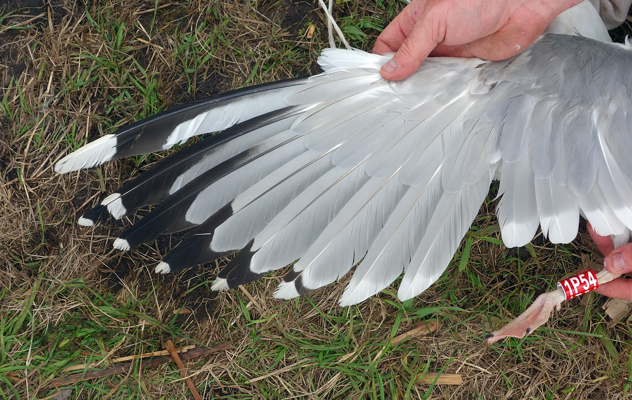 Larus cachinnans 1P54 adult, May 16 2013, Wytyckie Lake - Urszulin, Poland. Picture: Łukasz Bednarz ringing team. Please visit Łukasz's BLOG for beautiful drawings and up-to-date gull news from eastern Poland: Wildlife art and illustration For 2012, breeding location of 150 pairs cachinnans, of which 54 adults ringed and 158 pulli in 2012 (pers comm. Łukasz Bednarz). Breeding bird trapped at the nest. Deep white tongue on P10, and broad black band on P5; no black spot on P4. P1-P2 dropped, P1 growing; PMS=3. |