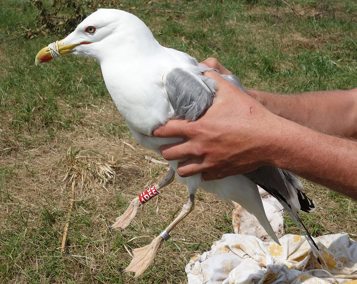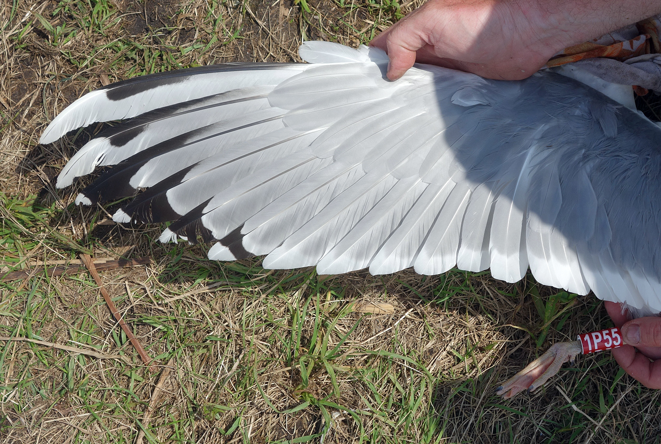 Larus cachinnans 1P55 adult, May 16 2013, Wytyckie Lake - Urszulin, Poland. Picture: Łukasz Bednarz ringing team. Please visit Łukasz's BLOG for beautiful drawings and up-to-date gull news from eastern Poland: Wildlife art and illustration For 2012, breeding location of 150 pairs cachinnans, of which 54 adults ringed and 158 pulli in 2012 (pers comm. Łukasz Bednarz). Breeding bird trapped at the nest. Adult, with limited speckling in iris. Red orbital ring and gape. Faint red on upper mandible; black on the upper and black on the lower mandible. Pale yellow legs.