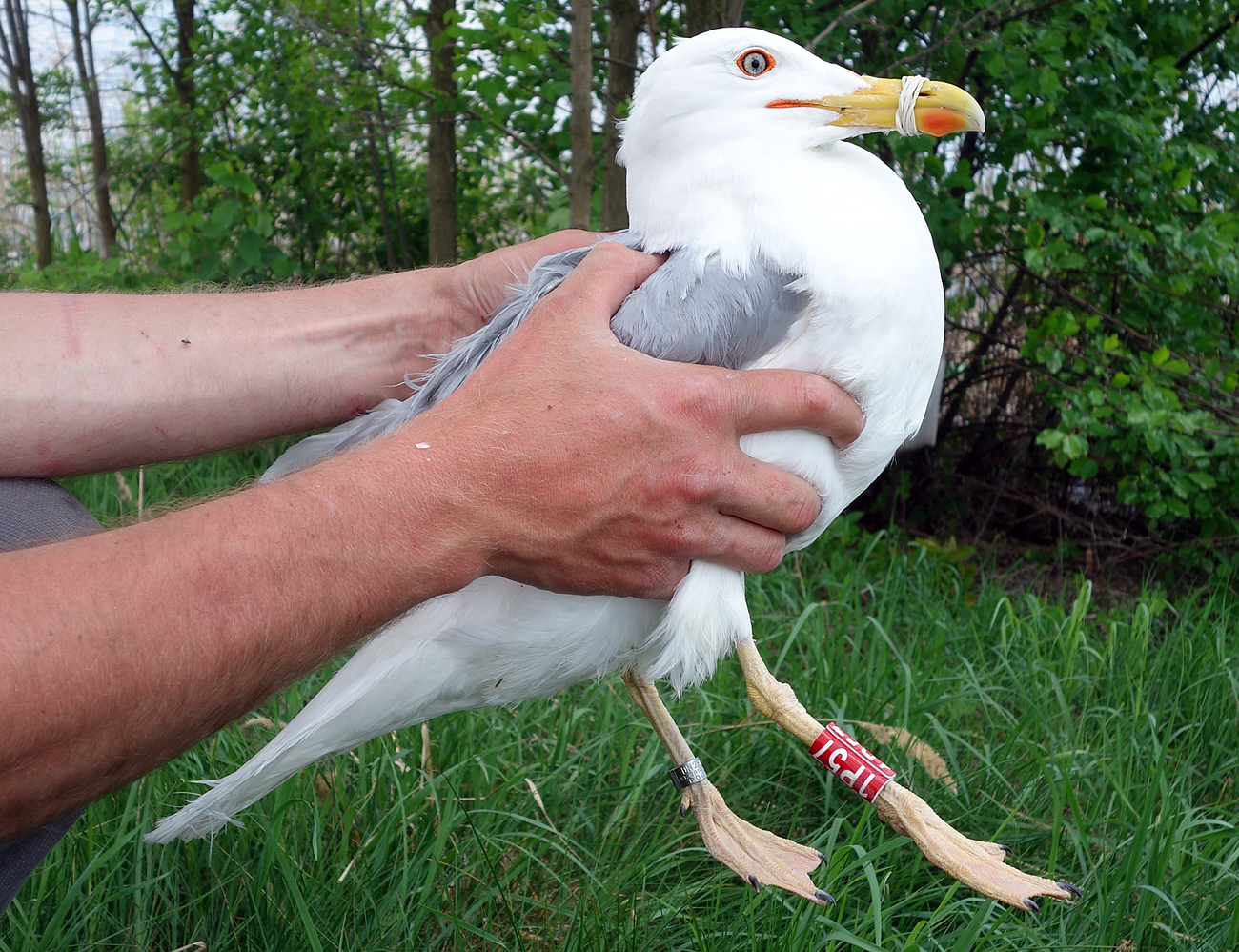 Larus cachinnans 1P57 adult, May 16 2013, Wytyckie Lake - Urszulin, Poland. Picture: Łukasz Bednarz ringing team. Please visit Łukasz's BLOG for beautiful drawings and up-to-date gull news from eastern Poland: Wildlife art and illustration For 2012, breeding location of 150 pairs cachinnans, of which 54 adults ringed and 158 pulli in 2012 (pers comm. Łukasz Bednarz). Breeding bird trapped at the nest. Adult, with dense speckling in iris. Red orbital ring and gape. No red on upper mandible; no black on the upper and no black on the lower mandible. Yellow legs.