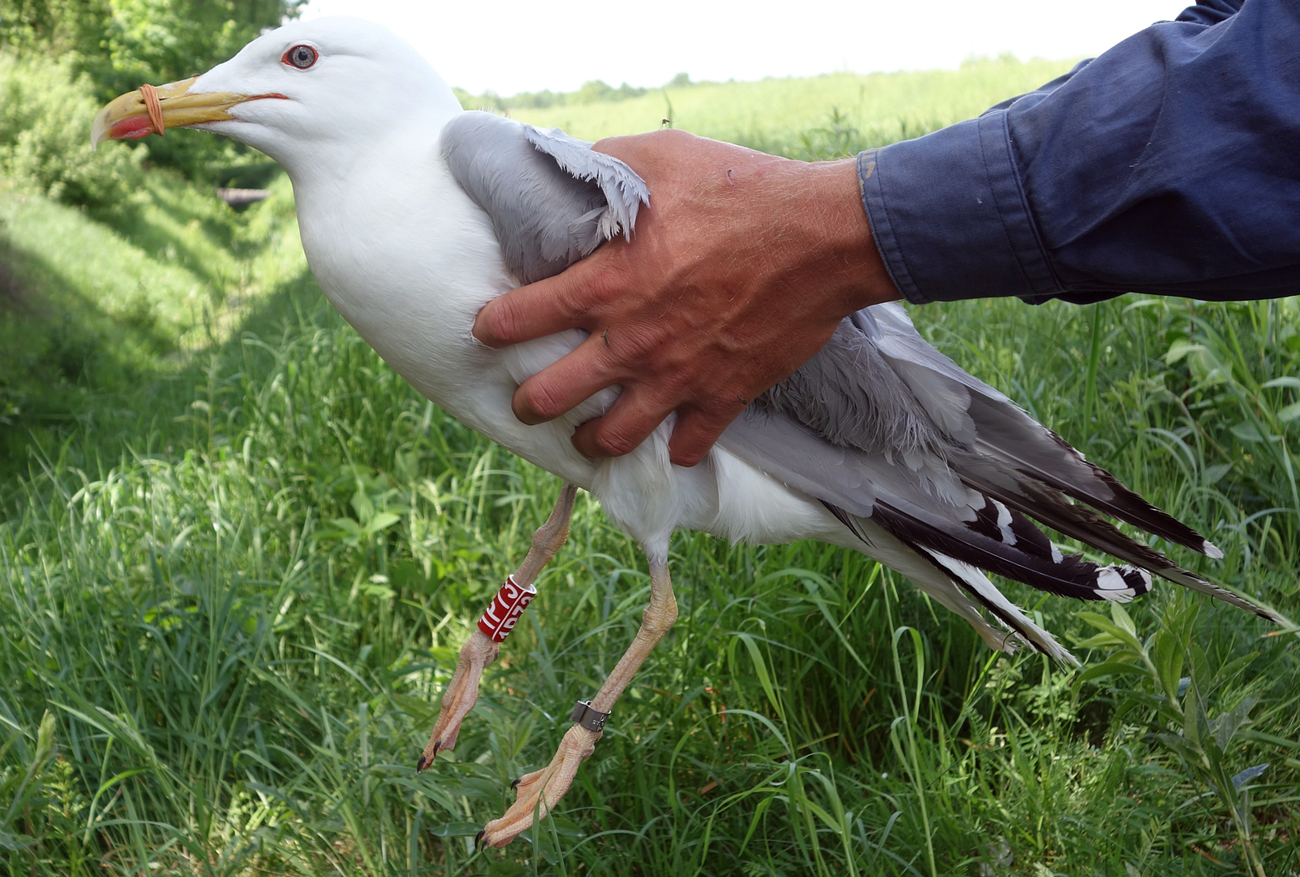 Larus cachinnans 1P73 adult, May 19 2013, Wytyckie Lake - Urszulin, Poland. Picture: Łukasz Bednarz ringing team. Please visit Łukasz's BLOG for beautiful drawings and up-to-date gull news from eastern Poland: Wildlife art and illustration For 2012, breeding location of 150 pairs cachinnans, of which 54 adults ringed and 158 pulli in 2012 (pers comm. Łukasz Bednarz). Breeding bird trapped at the nest. Adult, with dense speckling in iris. Red orbital ring and gape. No red on upper mandible; black on the upper and black on the lower mandible. Yellow legs.