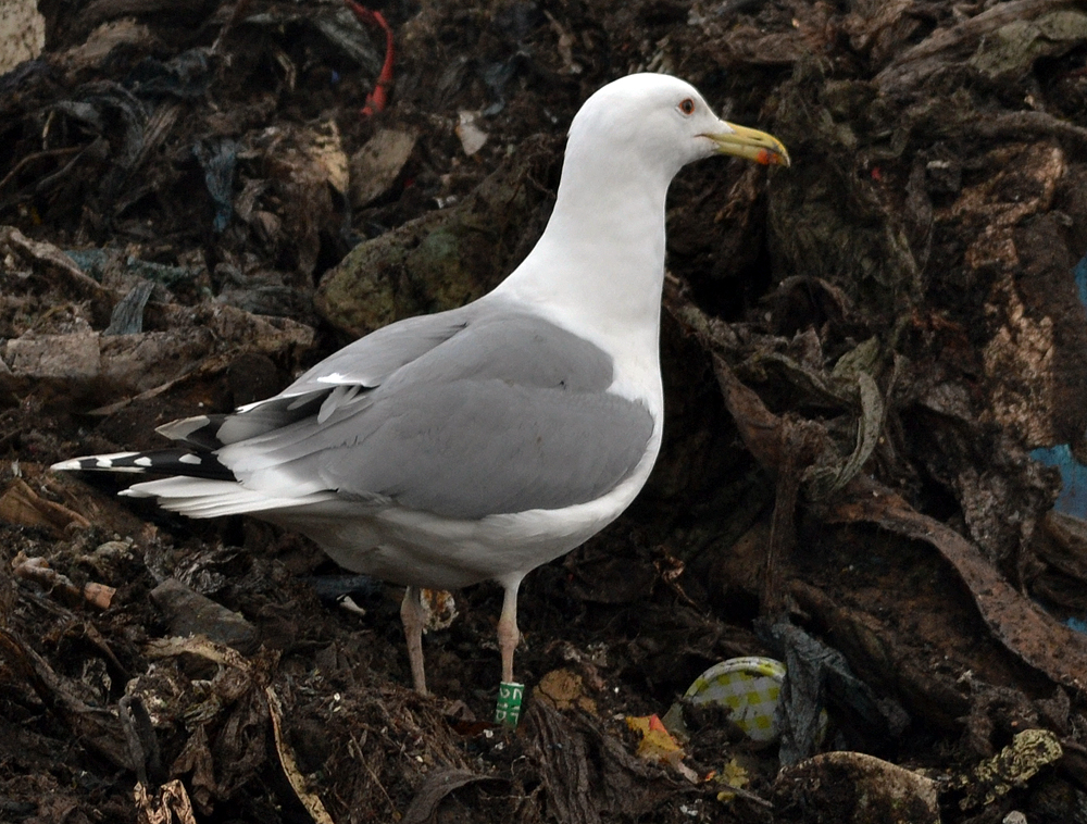 Green 21P1 and metal PLG DN-19496, ringed as pullus cachinnans on May 08 2006 at Wloclawek, central Poland (52°39' N, 19°08' E).