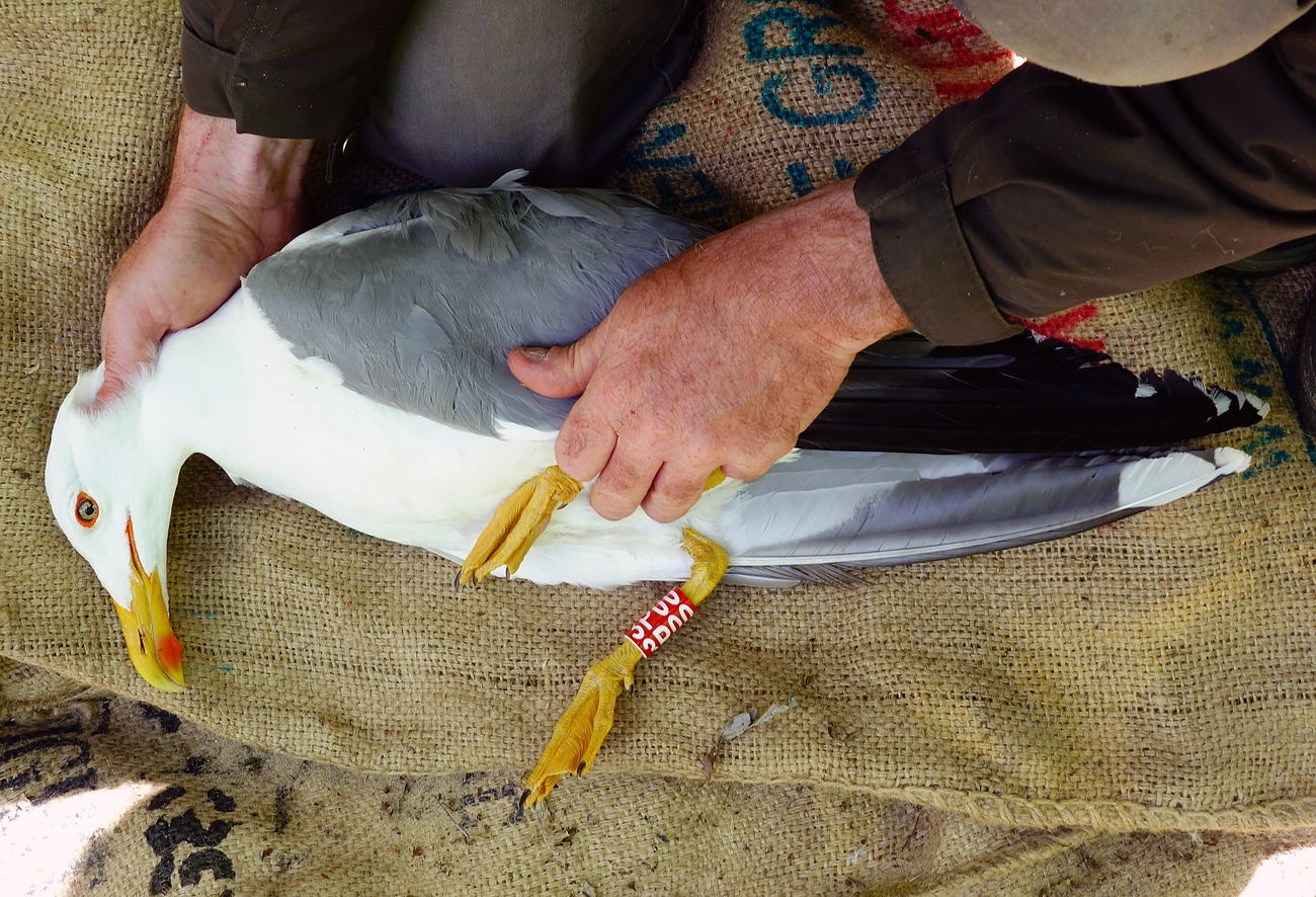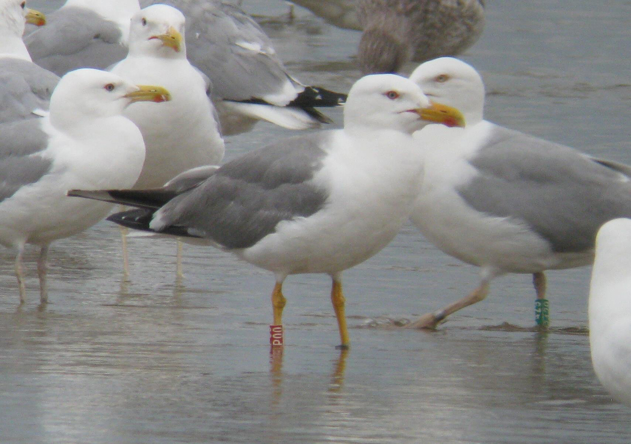 Larus argentatus sensu lato 3P00 adult, May 04 2014, Zastów Karczmiski, Poland. Picture: Łukasz Bednarz ringing team. Location: Zastów Karczmiski, Poland - colony at the banks of the Middle Vistula river. Middle Vistule river is a location where several taxa breed: see composition. Since this is a mixed breeding population where hybridisation is not uncommon, the ringing centre in Poland decided to label birds "Larus argentatus sensu lato". Still bulk of the breeding birds in Middle Vistula region show features of cachinnans. below: Larus argentatus sensu lato 3P00 adult, May 04 2014, Zastów Karczmiski, Poland. Picture: Łukasz Bednarz ringing team. Breeding bird trapped at the nest. Adult, with yellow legs, much black in wingtip, no mirror on P9, short pale tongue on P10, much black on innerweb of P8, full broad band on P5, red gape, red orbital ring, heavy bill with obvious gonys and red bleeding up onto the upper mandible. All feature point to adult Yellow-legged Gull michahellis.