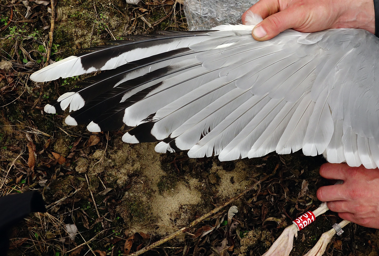 Larus argentatus sensu lato 3P01 adult, April 15 2014, Zastów Karczmiski, Poland. Picture: Łukasz Bednarz ringing team. Location: Zastów Karczmiski, Poland - colony at the banks of the Middle Vistula river. Middle Vistule river is a location where several taxa breed: see composition. Since this is a mixed breeding population where hybridisation is not uncommon, the ringing centre in Poland decided to label birds "Larus argentatus sensu lato". Still bulk of the breeding birds in Middle Vistula region show features of cachinnans. Breeding bird trapped at the nest. Adult, with almost thayeri pattern on P10. Deep tongue on P10 and full band on P5. Small dark marking on P4. This probably is adult cachinnans. |