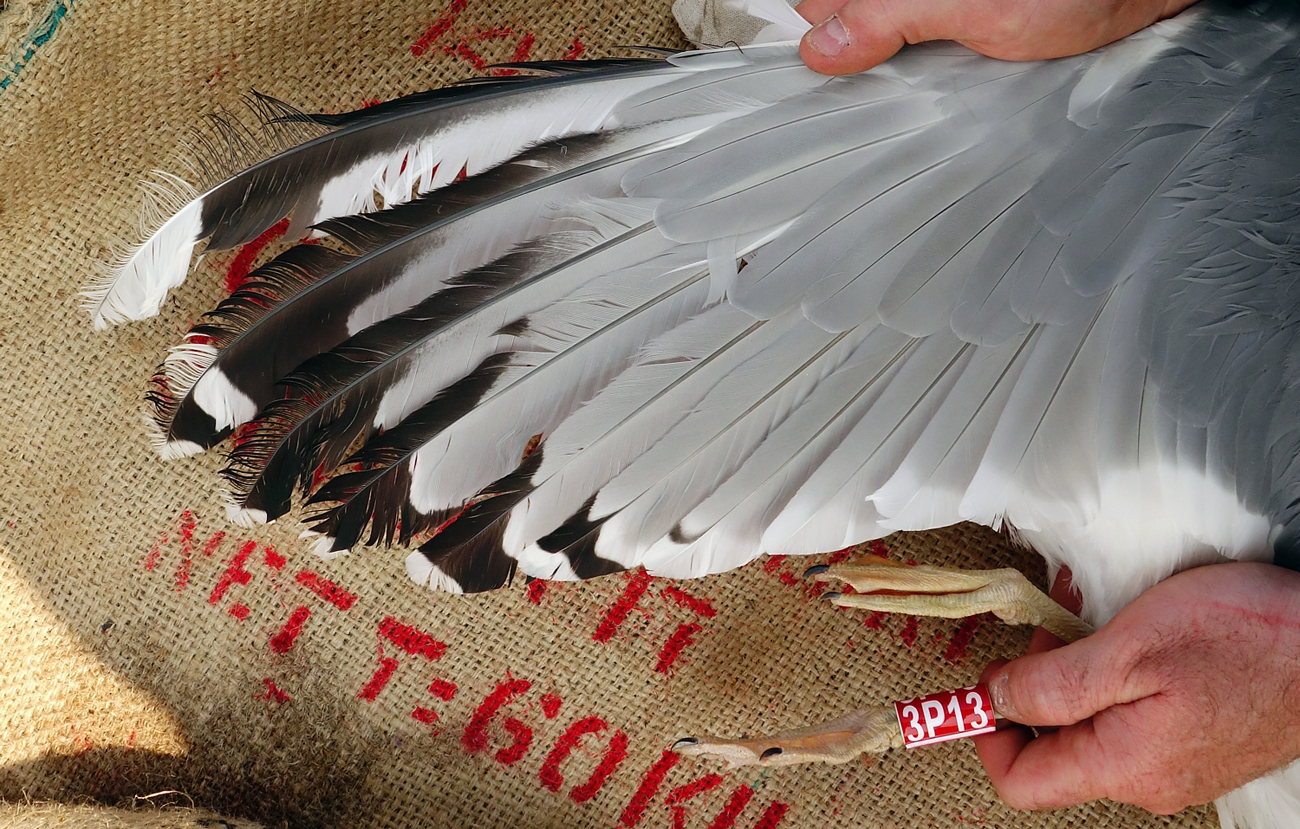 Larus cachinnans 3P13 adult, April 17 2014, Wytyckie Lake - Urszulin, Poland. Picture: Łukasz Bednarz ringing team. Please visit Łukasz's BLOG for beautiful drawings and up-to-date gull news from eastern Poland: Wildlife art and illustration For 2012, breeding location of 150 pairs cachinnans, of which 54 adults ringed and 158 pulli in 2012 (pers comm. Łukasz Bednarz). Breeding bird trapped at the nest. Adult, with deep tongue on P10, and broad band on P5; black on outerweb of P4. Heavy speckling in iris making dark eye. Red orbital ring and gape. Legs with yellow hue.