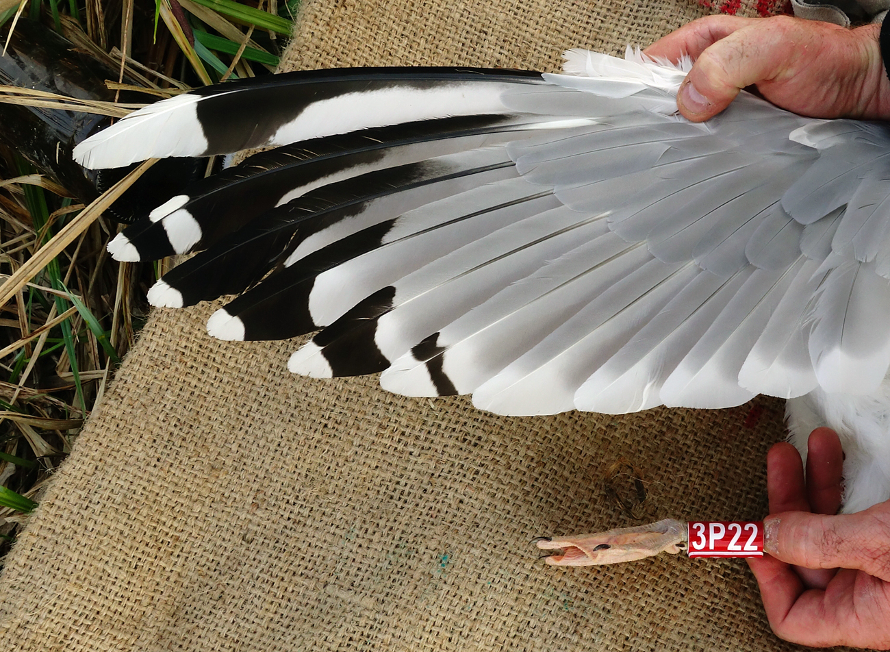 Larus cachinnans 3P22 adult, April 18 2014, Wytyckie Lake - Urszulin, Poland. Picture: Łukasz Bednarz ringing team. Please visit Łukasz's BLOG for beautiful drawings and up-to-date gull news from eastern Poland: Wildlife art and illustration For 2012, breeding location of 150 pairs cachinnans, of which 54 adults ringed and 158 pulli in 2012 (pers comm. Łukasz Bednarz). Breeding bird trapped at the nest. Adult, with deep white tongue on P10, and broad band on P5; no black on P4. Limited speckling in iris. Red orbital ring and gape. Faint red on upper mandible. Pink-fleshy legs.
