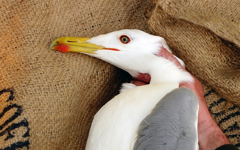 Larus cachinnans 3P29 adult, April 25 2014, Wytyckie Lake - Urszulin, Poland. Picture: Łukasz Bednarz ringing team. Please visit Łukasz's BLOG for beautiful drawings and up-to-date gull news from eastern Poland: Wildlife art and illustration For 2012, breeding location of 150 pairs cachinnans, of which 54 adults ringed and 158 pulli in 2012 (pers comm. Łukasz Bednarz). Breeding bird trapped at the nest. Adult, with deep white tongue on P10 (connected with tip = thayeri pattern), and broken band on P5; no black on P4. Moderate speckling in iris. Red orbital ring and gape. Red on upper mandible as well. Pink-fleshy legs with obvious yellow hue; black on both mandibles.