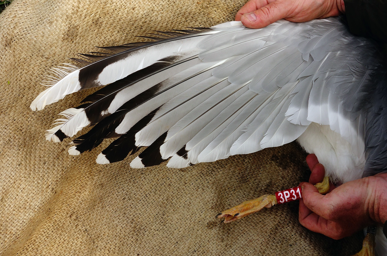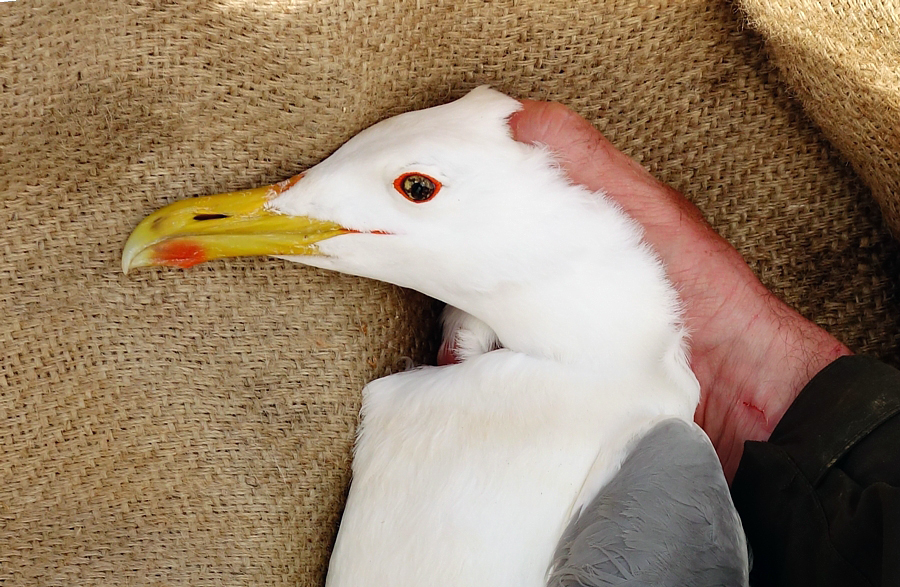 Larus cachinnans 3P31 adult, April 25 2014, Wytyckie Lake - Urszulin, Poland. Picture: Łukasz Bednarz ringing team. Please visit Łukasz's BLOG for beautiful drawings and up-to-date gull news from eastern Poland: Wildlife art and illustration For 2012, breeding location of 150 pairs cachinnans, of which 54 adults ringed and 158 pulli in 2012 (pers comm. Łukasz Bednarz). Breeding bird trapped at the nest. Adult, with deep white tongue on P10, and broken band on P5; no black on P4. Heavy speckling in iris. Red orbital ring and gape. No red on upper mandible; faint black on both mandibles. Pink-fleshy legs with obvious yellow hue.