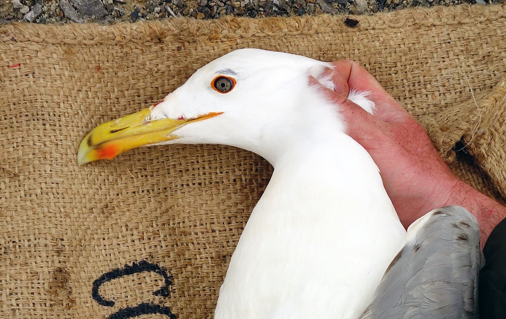 Larus cachinnans 3P32 sub-adult, April 25 2014, Wytyckie Lake - Urszulin, Poland. Picture: Łukasz Bednarz ringing team. Please visit Łukasz's BLOG for beautiful drawings and up-to-date gull news from eastern Poland: Wildlife art and illustration For 2012, breeding location of 150 pairs cachinnans, of which 54 adults ringed and 158 pulli in 2012 (pers comm. Łukasz Bednarz). Breeding bird trapped at the nest. Clearly sub-adult, probably 4CY. Medium white tongue on P10, no mirror on P9, and full band on P5; black on P4. Heavy speckling in iris. Orange orbital ring and yellowish gape. No red on upper mandible; black on both mandibles. Pink-fleshy legs.