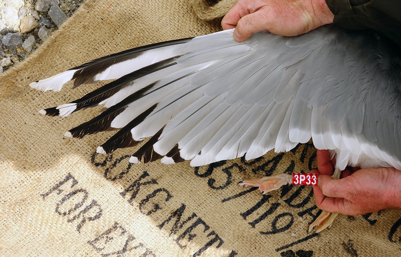 Larus cachinnans 3P33 adult, April 25 2014, Wytyckie Lake - Urszulin, Poland. Picture: Łukasz Bednarz ringing team. Please visit Łukasz's BLOG for beautiful drawings and up-to-date gull news from eastern Poland: Wildlife art and illustration For 2012, breeding location of 150 pairs cachinnans, of which 54 adults ringed and 158 pulli in 2012 (pers comm. Łukasz Bednarz). Breeding bird trapped at the nest. Adult, with deep white tongue on P10, and full band on P5; small black spot on P4. Moderate speckling in iris. Red orbital ring and gape. Obvious red on upper mandible; black on both mandibles. Pink-fleshy legs with yellow hue.