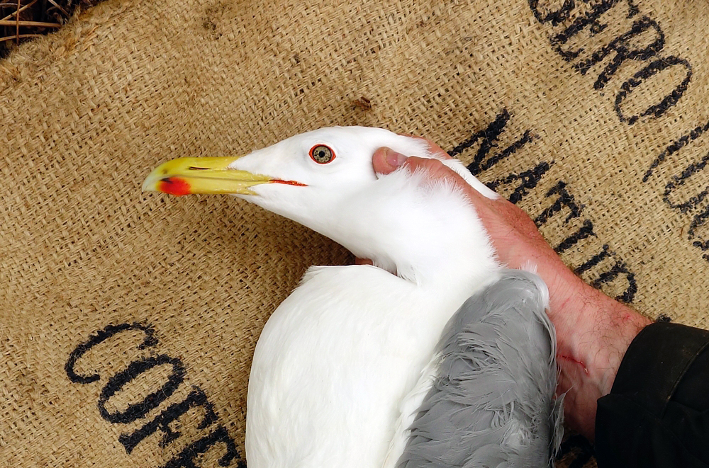 Larus cachinnans 3P34 adult, April 25 2014, Wytyckie Lake - Urszulin, Poland. Picture: Łukasz Bednarz ringing team. Please visit Łukasz's BLOG for beautiful drawings and up-to-date gull news from eastern Poland: Wildlife art and illustration For 2012, breeding location of 150 pairs cachinnans, of which 54 adults ringed and 158 pulli in 2012 (pers comm. Łukasz Bednarz). Breeding bird trapped at the nest. Adult, with deep white tongue on P10, and broken band on P5; no black spot on P4. Moderate speckling in iris. Red orbital ring and gape. No red on upper mandible; black on both mandibles. Pink-fleshy legs with yellow hue.