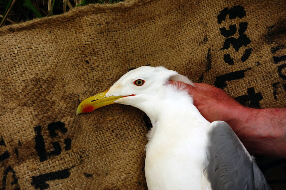 Larus cachinnans 3P39 adult, April 26 2014, Wytyckie Lake - Urszulin, Poland. Picture: Łukasz Bednarz ringing team. Please visit Łukasz's BLOG for beautiful drawings and up-to-date gull news from eastern Poland: Wildlife art and illustration For 2012, breeding location of 150 pairs cachinnans, of which 54 adults ringed and 158 pulli in 2012 (pers comm. Łukasz Bednarz). Breeding bird trapped at the nest. Adult, with deep white tongue on P10, and full broad band on P5; no black spot on P4. Dense speckling in iris. Red orbital ring and gape. Some red and some black on upper mandible; no black on lower mandible. Pink-fleshy legs with yellowish hue.