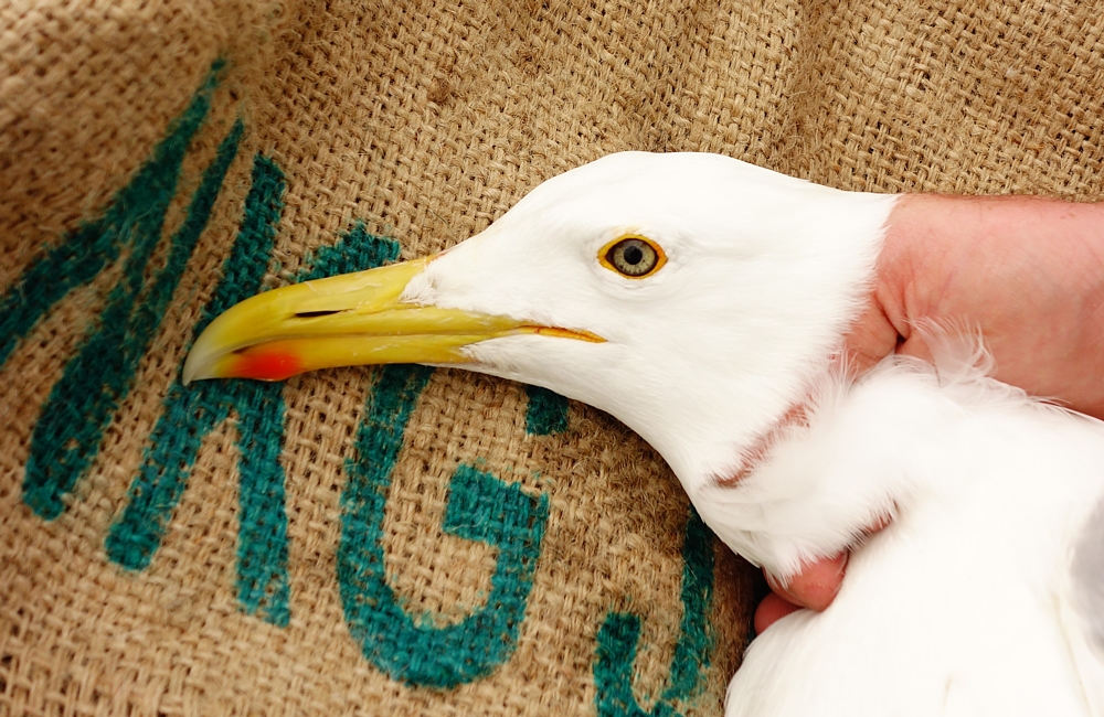 Larus argentatus sensu lato 3P43 adult, April 26 2014, Wytyckie Lake - Urszulin, Poland. Picture: Łukasz Bednarz ringing team. Please visit Łukasz's BLOG for beautiful drawings and up-to-date gull news from eastern Poland: Wildlife art and illustration For 2012, breeding location of 150 pairs cachinnans, of which 54 adults ringed and 158 pulli in 2012 (pers comm. Łukasz Bednarz). Taxa other than cachinnans are rare in this east Polish population, still mixed breeding can be suspected with migration of birds from the middle Vistula; and hybridisation may take place at very low level. Therefore the ringing centre in Poland decided to label such birds "Larus argentatus sensu lato". Still bulk of the breeding birds in Urszulin region show features of cachinnans. Breeding bird trapped at the nest. Adult, with medium white tongue on P10, and full broad band on P5; black spot on P4. Moderate speckling in iris. Yellow-orange orbital ring and yellow gape. No red on upper mandible (gonys spot hardly reaching to cutting edge); faint black on lower mandible; moderate gonys angle. Pink-fleshy legs with yellowish hue. This bird might be an extreme in pure cachinnans, showing much black in the wingtip, or maybe has inherited some genetics from argentatus; probably best labeled 'not further determined'.