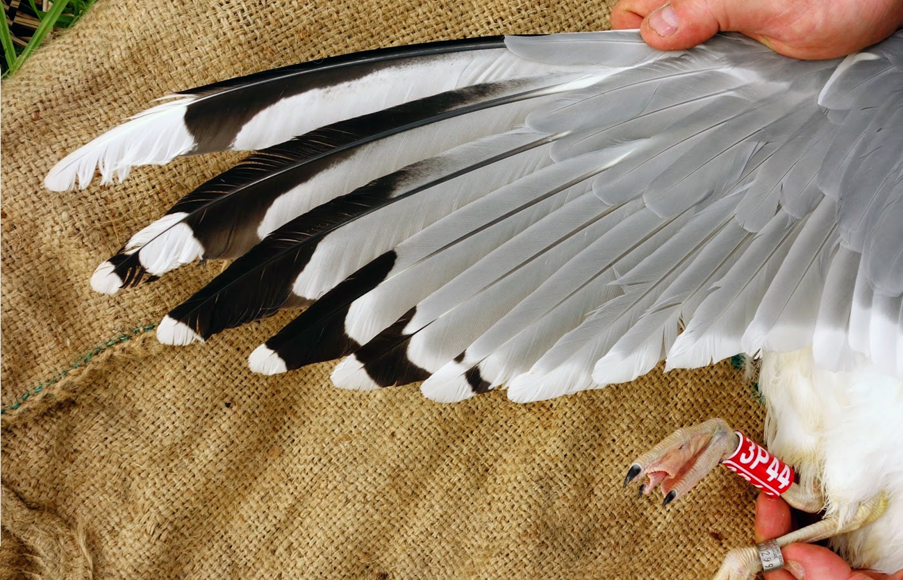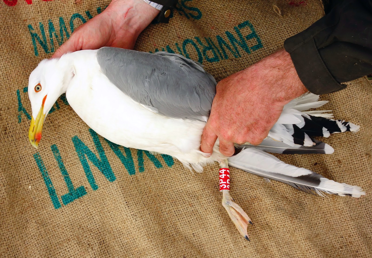Larus cachinnans 3P44 & UKK T002999 9CY, April 27 2014, Wytyckie Lake - Urszulin, Poland. Picture: Łukasz Bednarz ringing team. Metal ring UKK T002999, 9CY female Caspian Gull Larus cachinnans, trapped at the nest during incubation on the Wytyckie Lake, end of April 2014. This bird has been ringed as a chick in the Kaniv, Dniepr River, Cherkassy district of Ukraine (610 km away), in May 2006. In 2014 the plastic ring was added. Please visit Łukasz's BLOG for beautiful drawings and up-to-date gull news from eastern Poland: Wildlife art and illustration For 2012, breeding location of 150 pairs cachinnans, of which 54 adults ringed and 158 pulli in 2012 (pers comm. Łukasz Bednarz). Breeding female trapped at the nest. 9CY, with deep white tongue on P10; broken band on P5; no black spot on P4. Very limited speckling in iris. iris is relatively pale. Red orbital ring and gape. No red on upper mandible; black on the upper and lower mandible. Pink-fleshy legs with yellow hue.