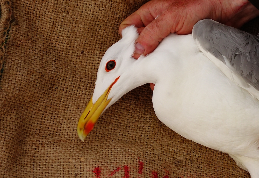 Larus cachinnans 3P47 sub-adult, April 26 2014, Wytyckie Lake - Urszulin, Poland. Picture: Łukasz Bednarz ringing team. Please visit Łukasz's BLOG for beautiful drawings and up-to-date gull news from eastern Poland: Wildlife art and illustration For 2012, breeding location of 150 pairs cachinnans, of which 54 adults ringed and 158 pulli in 2012 (pers comm. Łukasz Bednarz). Breeding bird trapped at the nest, with dark marks on greater primary coverts, probably 5CY/ near-adult. With medium white tongue on P10 (medial band remains broader than white tip), and full broad band on P5; no black spot on P4. Dense speckling in iris. Red orbital ring and gape. Faint red on upper mandible; black on lower and upper mandible. Pink-fleshy legs with yellow hue.