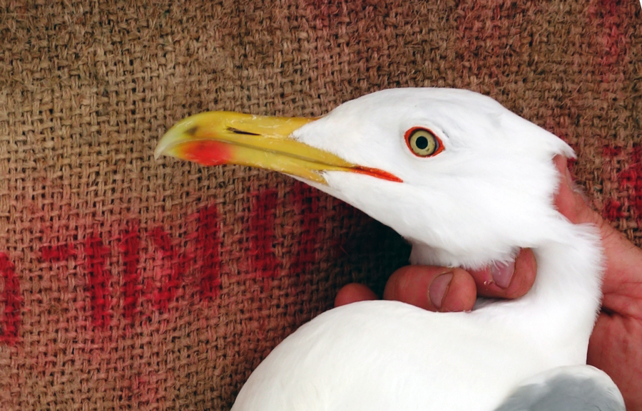 Larus cachinnans 3P49 sub-adult, April 26 2014, Wytyckie Lake - Urszulin, Poland. Picture: Łukasz Bednarz ringing team. Please visit Łukasz's BLOG for beautiful drawings and up-to-date gull news from eastern Poland: Wildlife art and illustration For 2012, breeding location of 150 pairs cachinnans, of which 54 adults ringed and 158 pulli in 2012 (pers comm. Łukasz Bednarz). Breeding bird trapped at the nest, with dark marks on greater primary coverts, probably 5CY/ near-adult. With deep white tongue on P10, and full broad band on P5; small black spot on P4. Limited speckling in iris. Red orbital ring and gape. Faint red on upper mandible; black on lower (faint) and upper mandible. Pale yellow legs.