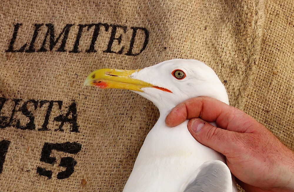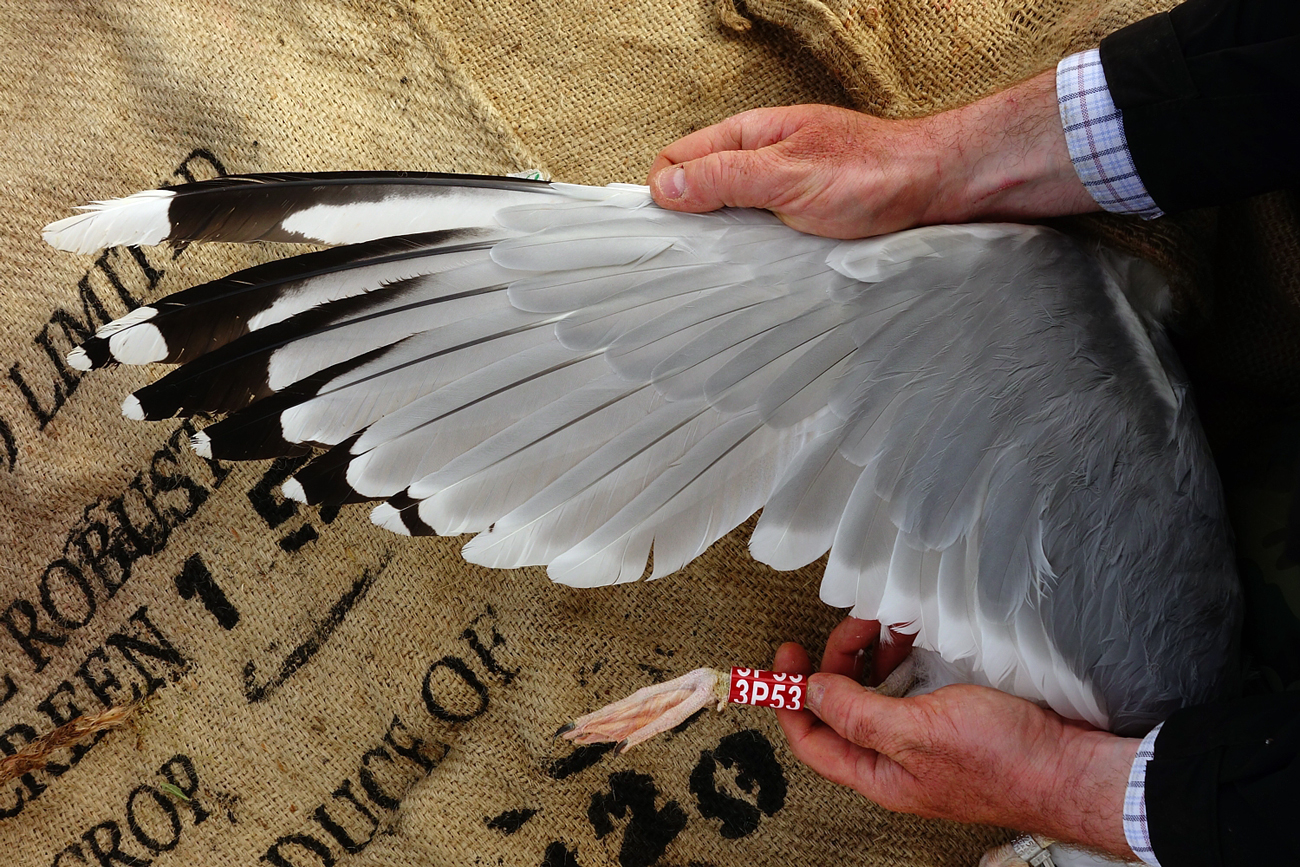 Larus cachinnans 3P53 adult, April 29 2014, Wytyckie Lake - Urszulin, Poland. Picture: Łukasz Bednarz ringing team. Please visit Łukasz's BLOG for beautiful drawings and up-to-date gull news from eastern Poland: Wildlife art and illustration For 2012, breeding location of 150 pairs cachinnans, of which 54 adults ringed and 158 pulli in 2012 (pers comm. Łukasz Bednarz). Breeding bird trapped at the nest. Adult, with deep white tongue on P10, and full broad band on P5; small black spot on P4. Limited speckling in iris. Red orbital ring and gape. No red on upper mandible; black on the upper and lower mandible. Pink-fleshy legs.