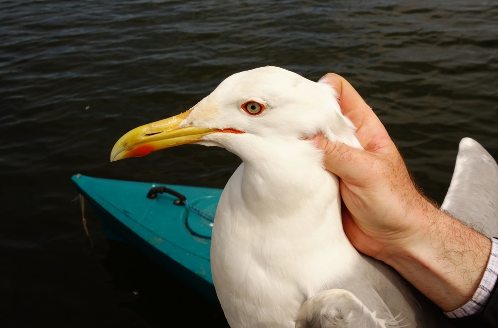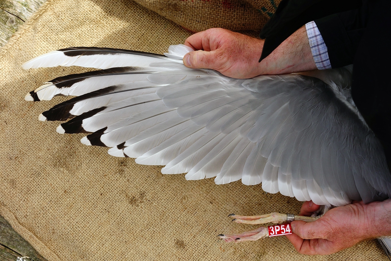 Larus cachinnans 3P54 adult, April 29 2014, Wytyckie Lake - Urszulin, Poland. Picture: Łukasz Bednarz ringing team. Please visit Łukasz's BLOG for beautiful drawings and up-to-date gull news from eastern Poland: Wildlife art and illustration For 2012, breeding location of 150 pairs cachinnans, of which 54 adults ringed and 158 pulli in 2012 (pers comm. Łukasz Bednarz). Breeding bird trapped at the nest. Adult, with deep white tongue on P10: thayeri pattern on both P9 and P10. Broken band on P5; no black spot on P4. Limited speckling in iris. Red orbital ring and gape. No red on upper mandible; black on the upper and lower mandible. Pink-fleshy legs with yellow hue.