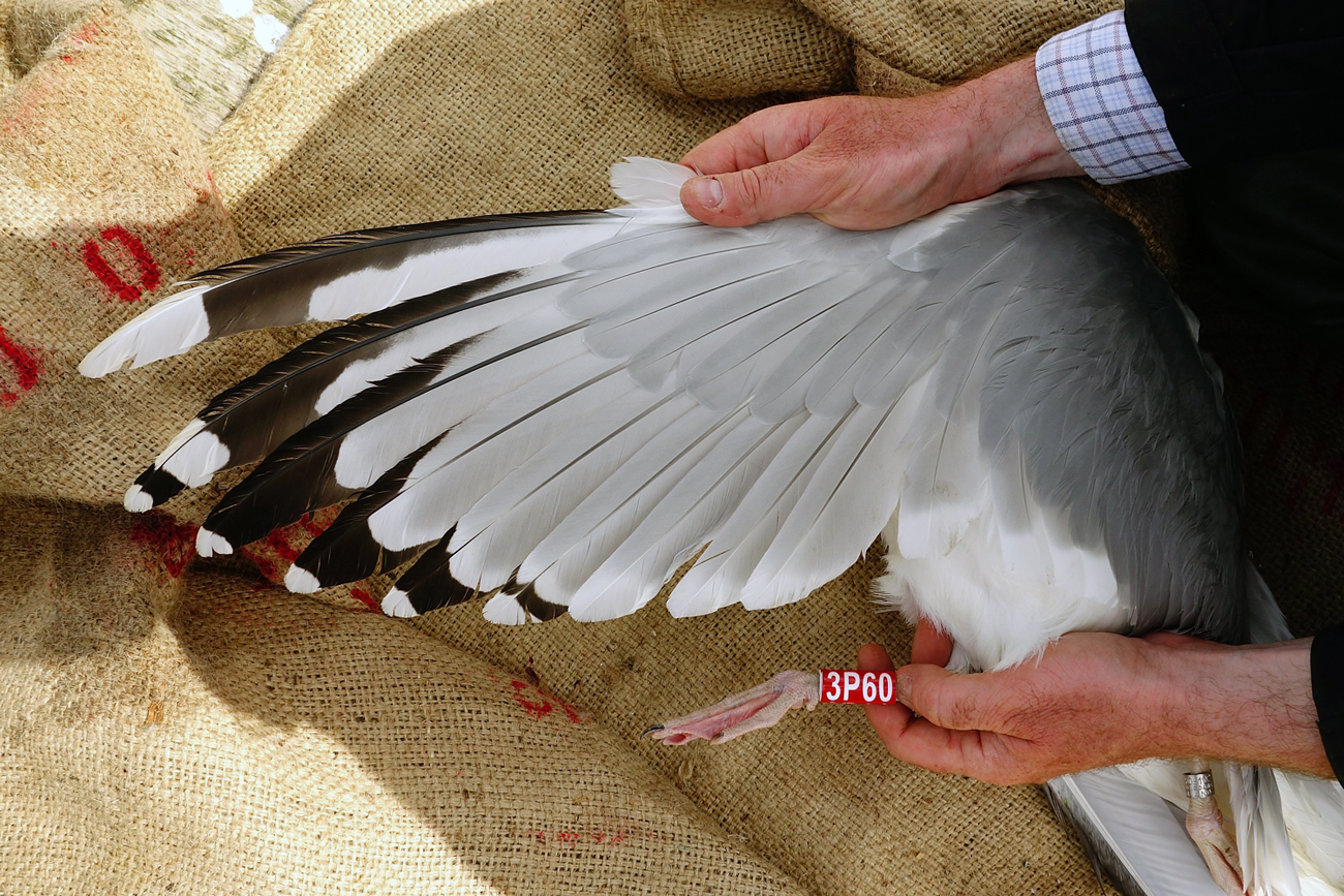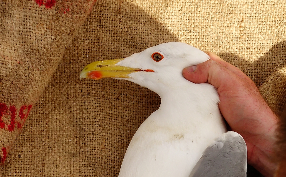 Larus cachinnans 3P60 adult, April 29 2014, Wytyckie Lake - Urszulin, Poland. Picture: Łukasz Bednarz ringing team. Please visit Łukasz's BLOG for beautiful drawings and up-to-date gull news from eastern Poland: Wildlife art and illustration For 2012, breeding location of 150 pairs cachinnans, of which 54 adults ringed and 158 pulli in 2012 (pers comm. Łukasz Bednarz). Breeding bird trapped at the nest. Adult, with dense speckling in iris. Red orbital ring and gape. No red on upper mandible; faint black on the upper mandible.