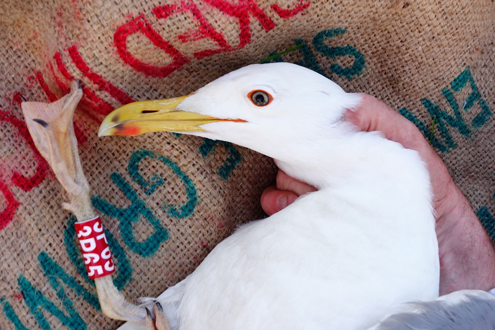 Larus cachinnans 3P65 adult, April 30 2014, Wincentów - Lublin, Poland. Picture: Łukasz Bednarz ringing team. Please visit Łukasz's BLOG for beautiful drawings and up-to-date gull news from eastern Poland: Wildlife art and illustration Breeding bird trapped at the nest. Adult, with dense speckling in iris. Orange-red orbital ring and gape. No red on upper mandible; black on the upper and lower mandible.
